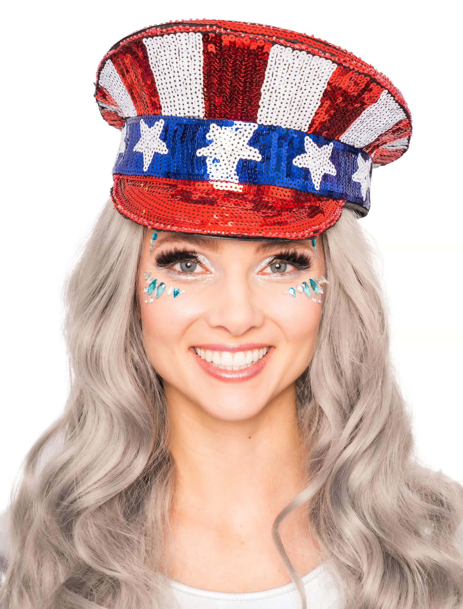 Wenn Du an Fasching oder Karneval oder auch auf jedem Festival das Land der unbegrenzten Möglichkeiten vertreten möchtest, triffst Du mit dieser USA Kappe die richtige und attraktive Entscheidung. Rot-weiße Streifen und ein blaues Band mit weißen Sternen symbolisieren die Flagge der USA auf der komplett mit Pailletten besetzten Kappe. Sie besteht zu 90 Prozent aus Polyester und zu 10 Prozent aus Plastik.