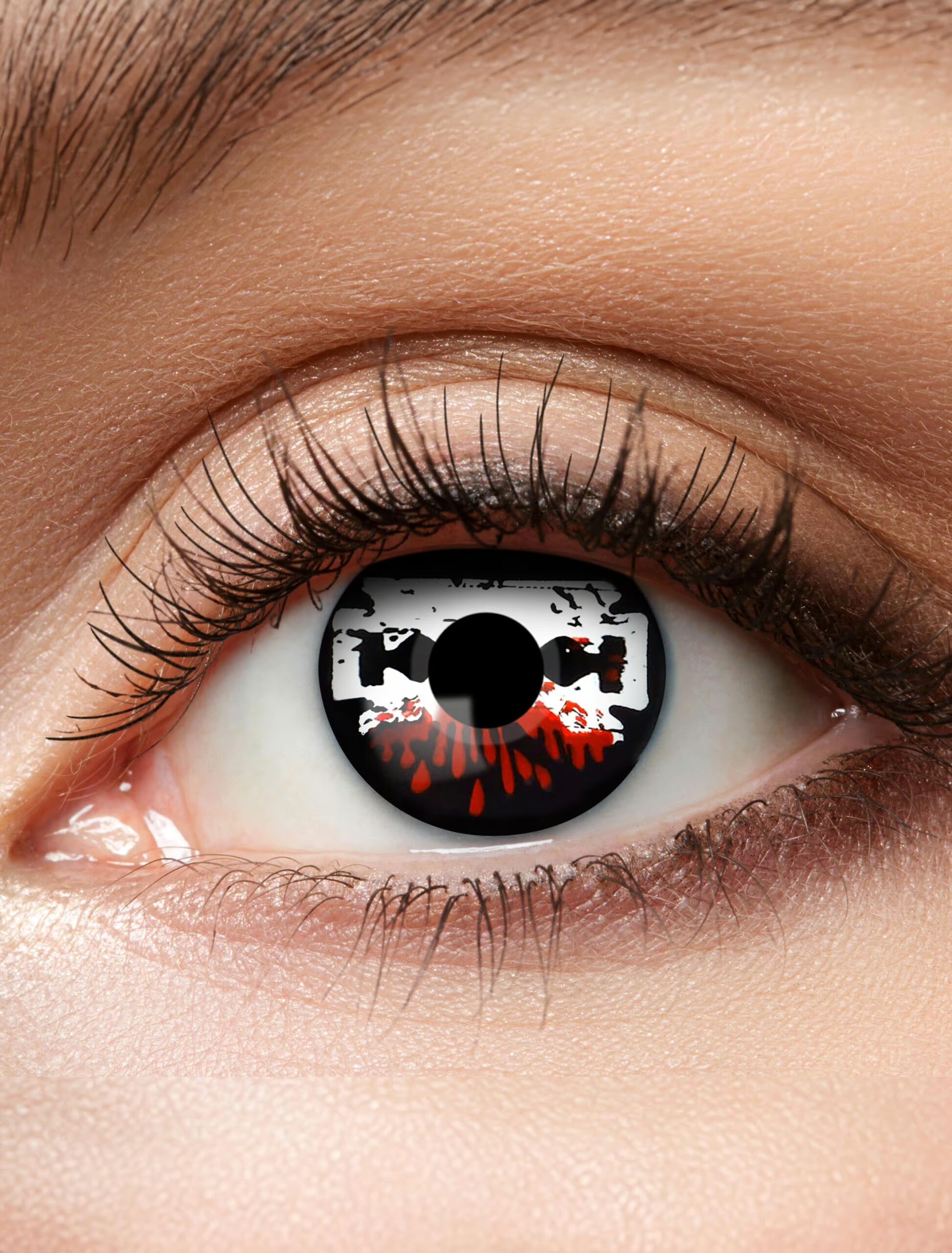 Schau mir in die Augen Kleines! Diese gruseligen Augen haben eine wahrhaft erschreckende Wirkung – Gänsehaut vorprogrammiert. Die sehr hochwertigen, schwarzen Kontaktlinsen sind mit einer weißen, blutverschmierten Rasierklinge bedruckt, die scheinbar direkt in die Pupille schneidet. Genau das Richtige, um an Halloween für Angst und Schrecken zu sorgen – aber auch an Karneval nicht verkehrt!