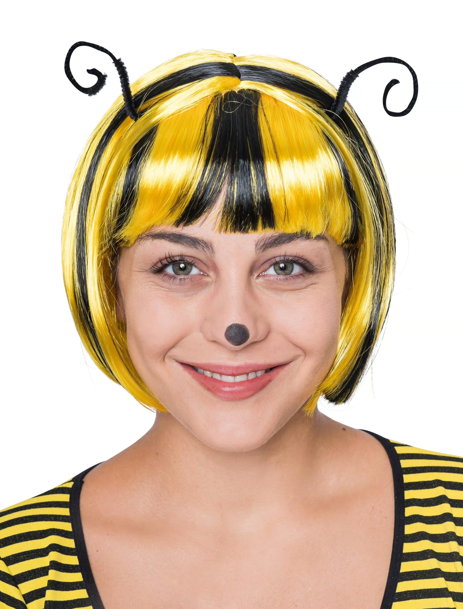 Egal ob Fasching, Karneval, Geburtstag oder verschiedene Partys. Mit unserer Bienen Perücke wirst Du der Bienen-Star! Die Perücke ‘Biene mit Fühlern’ ist eine schwarz-gelbe Kunsthaar Perücke in Kinnhöhe mit schwarzen Fühlern. Sie ist aus 100% Polyester gefertigt. Das dazugehörige Bienen Kostüm, diverse Zubehörteile wie Haarreif oder Flügel und vieles mehr findest Du natürlich bei uns.