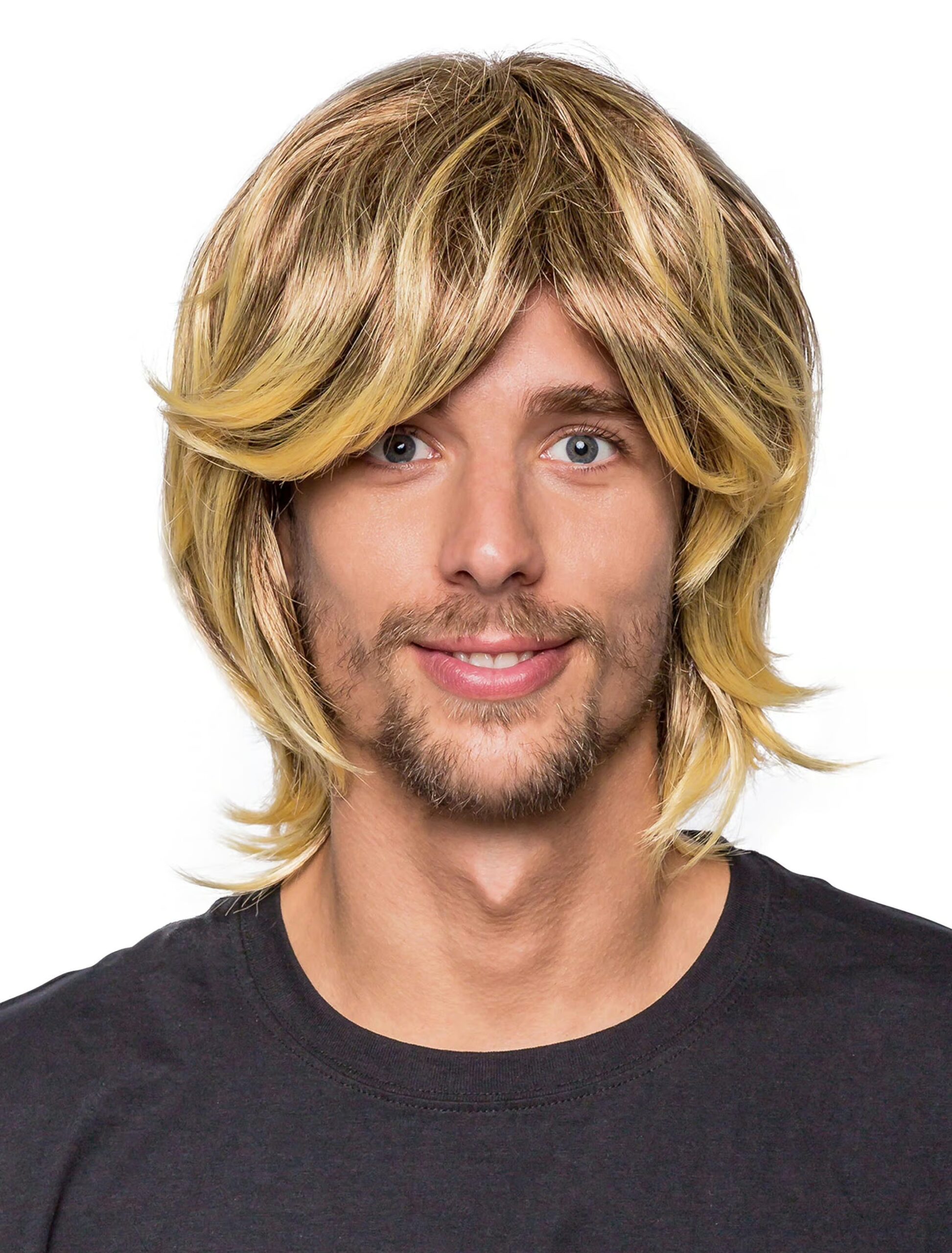 Ausgefallene Perücke für alle Herren, die ihr Haar auf der nächsten Party lang tragen wollen. Die Perücke besteht aus blondem Kunsthaar, das bis zu den Schultern reicht und mit vielen dunkleren Strähnchen verziert ist. Perfekt zu allen flippigen 70er- oder 80er-Jahre-Kostümen!