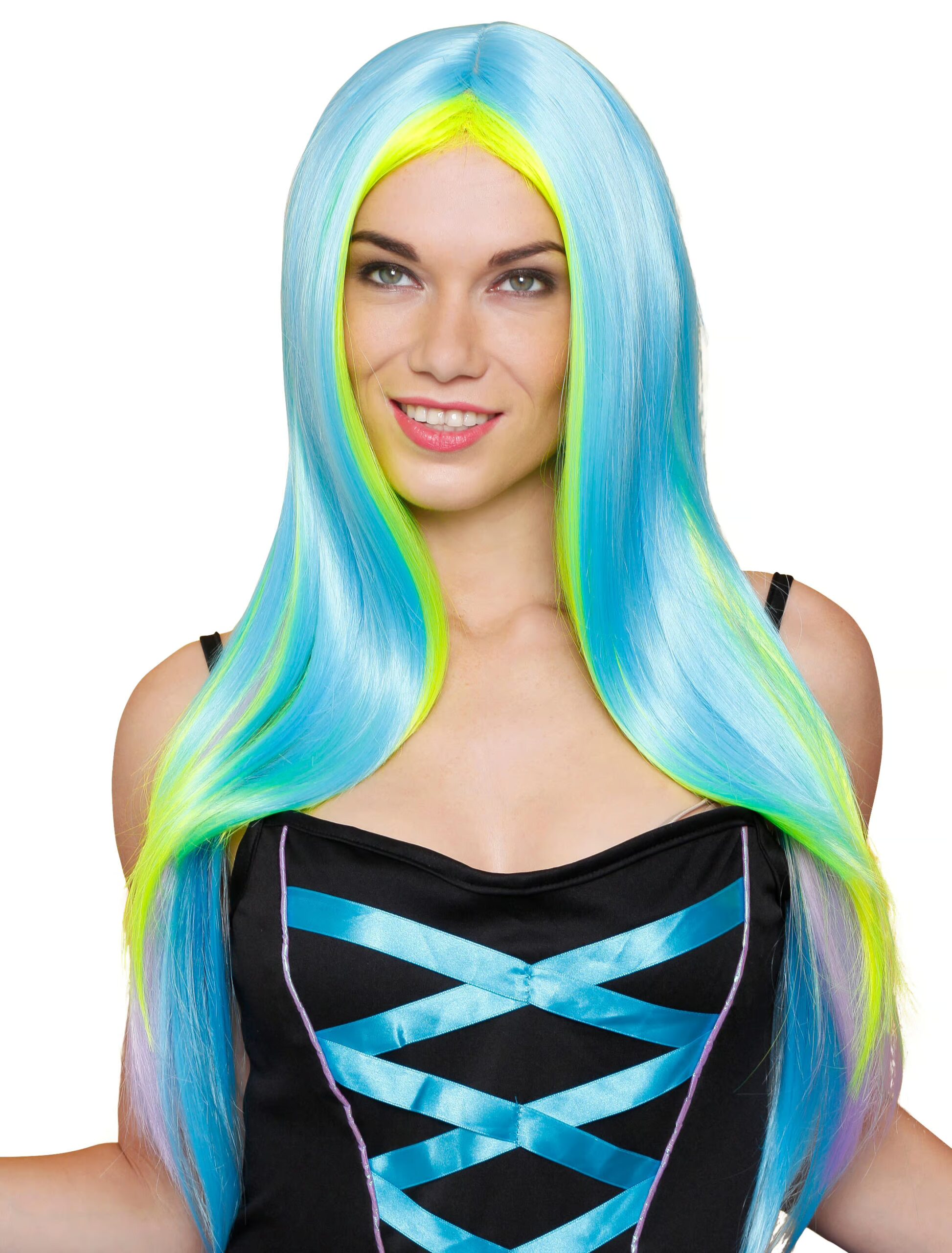 Kostümzubehör Kostümzubehör Perücke lang glatt Faceframe blau/grün/lila