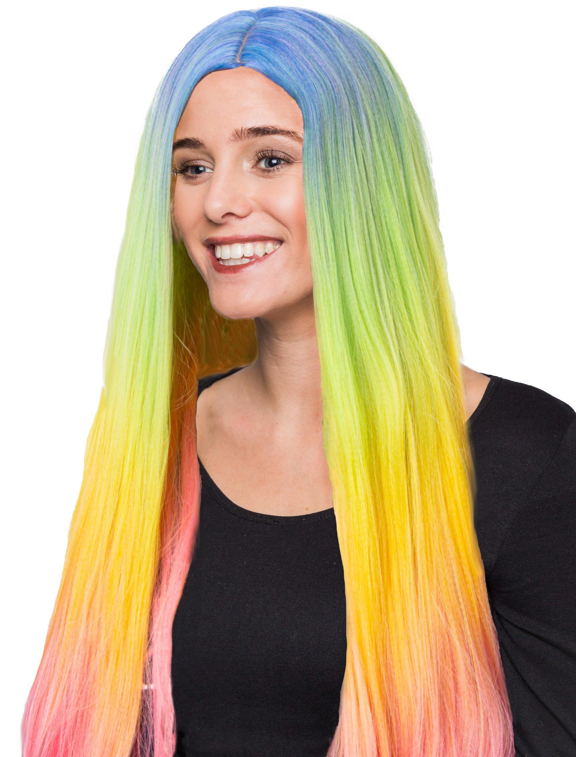 Kaum ein Accessoire ist so typverändernd wie eine Perücke. Dieses Exemplar besteht aus langem Kunsthaar, das durch seinen bunten Farbverlauf an einen Regenbogen erinnert. Das glatte Haar ragt bis zur Hüfte und ist die perfekte Kombination zu zahlreichen Kostümen und Verkleidungen. Perfekt für alle Damen mit Mut zur Farbe und Veränderung!