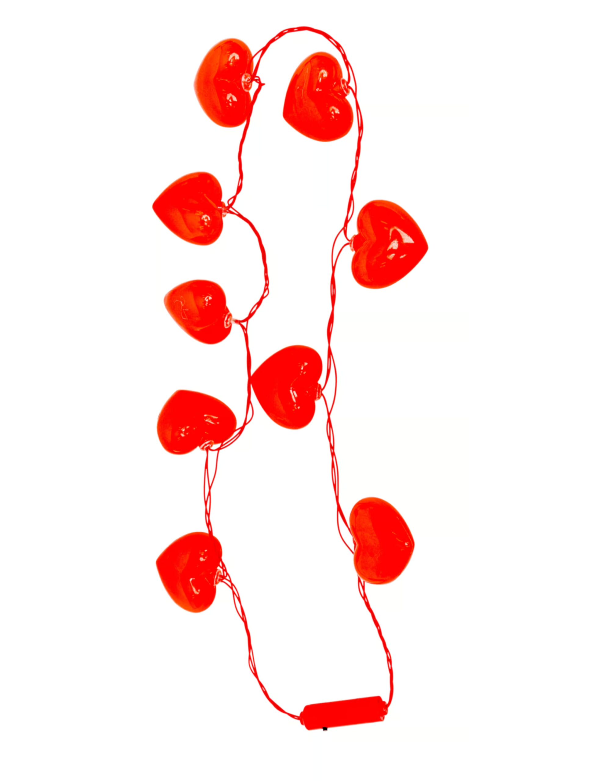 Diese attraktive Halskette mit den großen roten, blinkenden Herzen aus Kunststoff inklusive Knopfzellen-Batterien ist der absolute Hingucker und mit vielen FaschingsKostümen gut kombinierbar. Mit ihr kannst Du Deinem Verehrer, über die Leuchtfunktion mit langsamen oder schnellem Blinken sowie dem Fade-In-Fade-Out, auf ganz charmante Art zeigen wie schnell Dein Herz für ihn schlägt. Bei Nichtgefallen schaltest Du die Kette mittels mit Ein- und Ausschalter einfach aus.