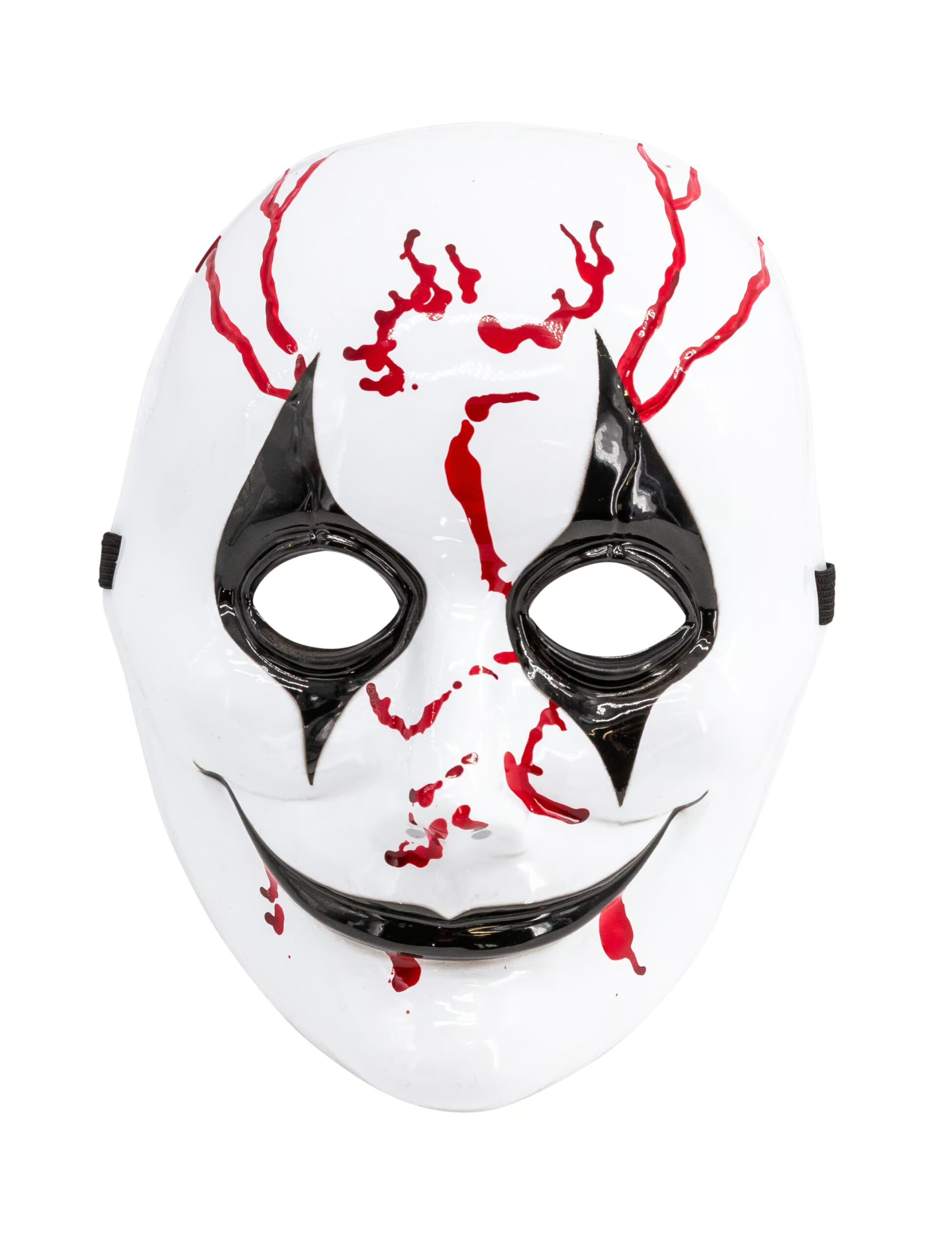 Ein Schocker auf Halloween! Diese blutige Maske verbreitet auf jeder Halloweenparty Angst und Schrecken. Kein Wunder, denn die weiße Maske ist mit vielen roten Blutspuren verziert. Der schwarze, grinsende Mund und die schwarz umrandeten Augenaussparungen runden den düsteren Look der Maske ab. Mit einem Gummiband kannst Du die blutige Clown Maske bequem tragen.