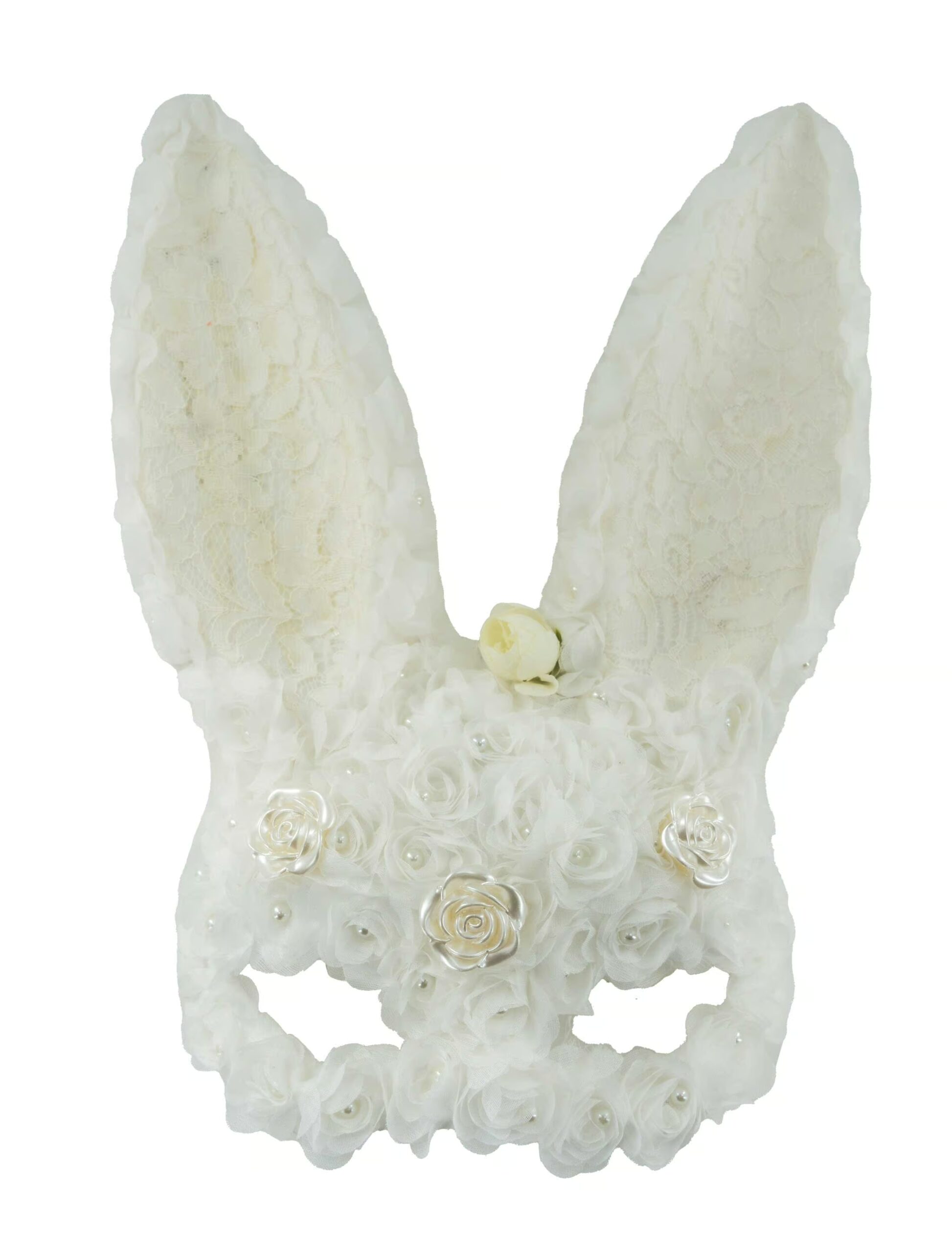 Diese hübsche Bunny-Maske ist mit zahlreichen kleinen Stoffrosen verziert, die zusätzlich mit zarten Perlen geschmückt sind. Die langen Hasenohren sind mit feiner Spitze überzogen und geben der Maske einen eleganten, romantischen Look. Ein echter Hingucker für besondere Anlässe wie Karneval, Maskenbälle, Fotoshootings oder Motto-Partys.