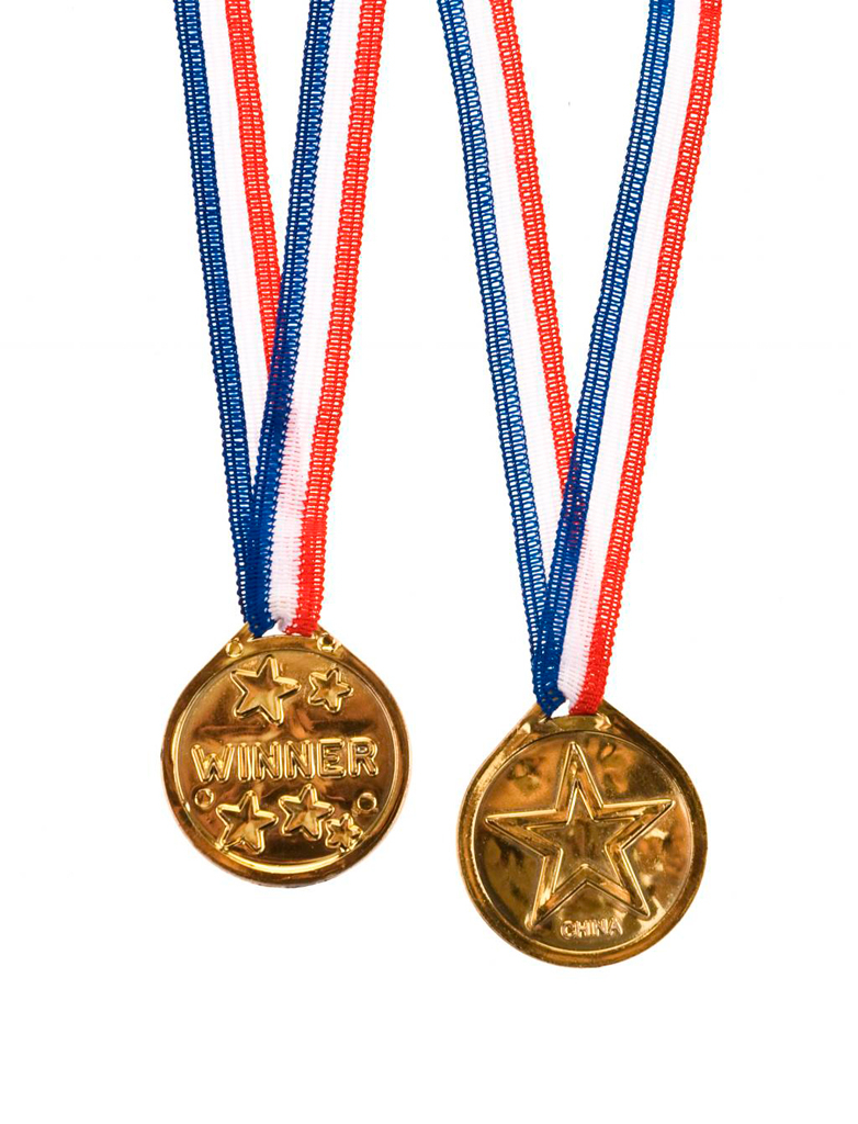 Vom Ehrgeiz gepackt! So eine Medaille möchte nicht nur jedes Kind haben! Ob auf Geburtstagen oder Feten: wenn Gewinnern diese Medaille überreicht wird, ist die Freude gleich doppelt so groß! Geziert werden die hübschen, goldfarbenen Medaillen von Sternen und der Aufschrift WINNERâ€. Mithilfe der praktischen Bänder in Rot und Blau lassen sich die Trophäen bequem um den Hals tragen.