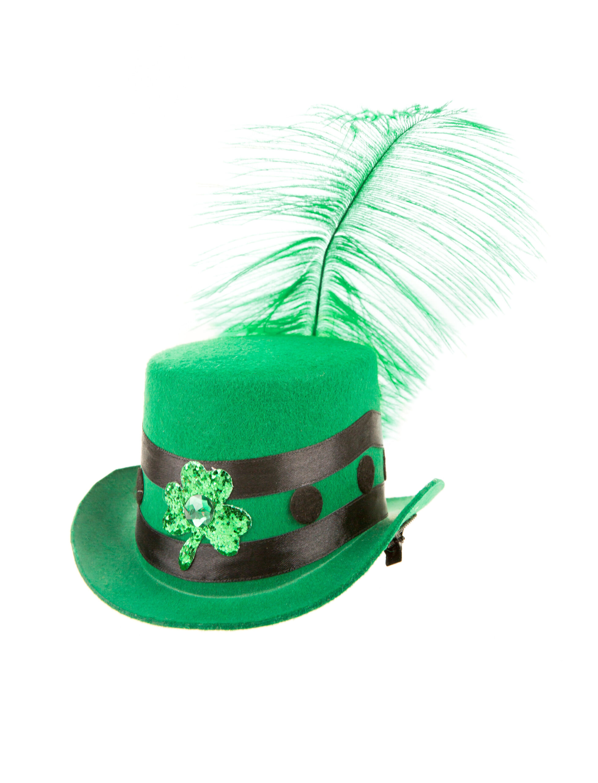 Dieser schicke Minihut ist nicht nur zum St. Patrick’s Day ein echter Hingucker! Der kleine, grüne Zylinder ist mit schwarzen Hutbändern, Punkten, einem goldenen Kleeblatt und einer echten Feder geschmückt. Dank zwei Haarklammern bleibt Deine Kopfbedeckung fest an Ort und Stelle! Das perfekte Accessoire für Dein St. Patrick’s Day Kostüm.