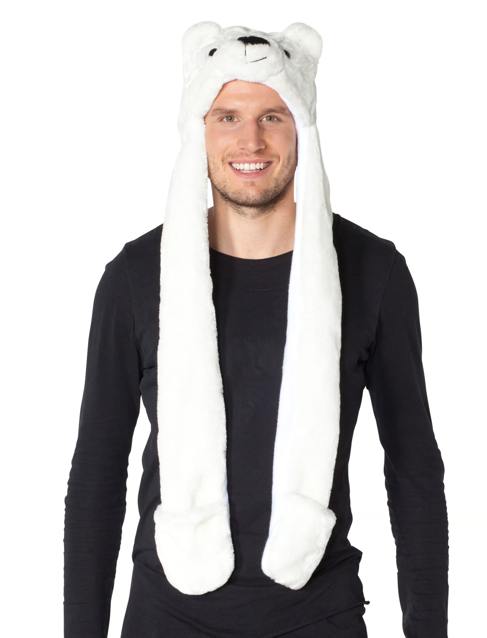 Als waschechter Nordpolbewohner weißt Du wie die kalten Temperaturen sind. Die Eisbären-Mütze aus Plüsch-Stoff mit den integrierten Handschuhen halten Dich an den kalten Tagen schön warm. Sie darf Dir auf keinen Fall fehlen. Eine schöne Kopfbedeckung an Karneval und Fasching.