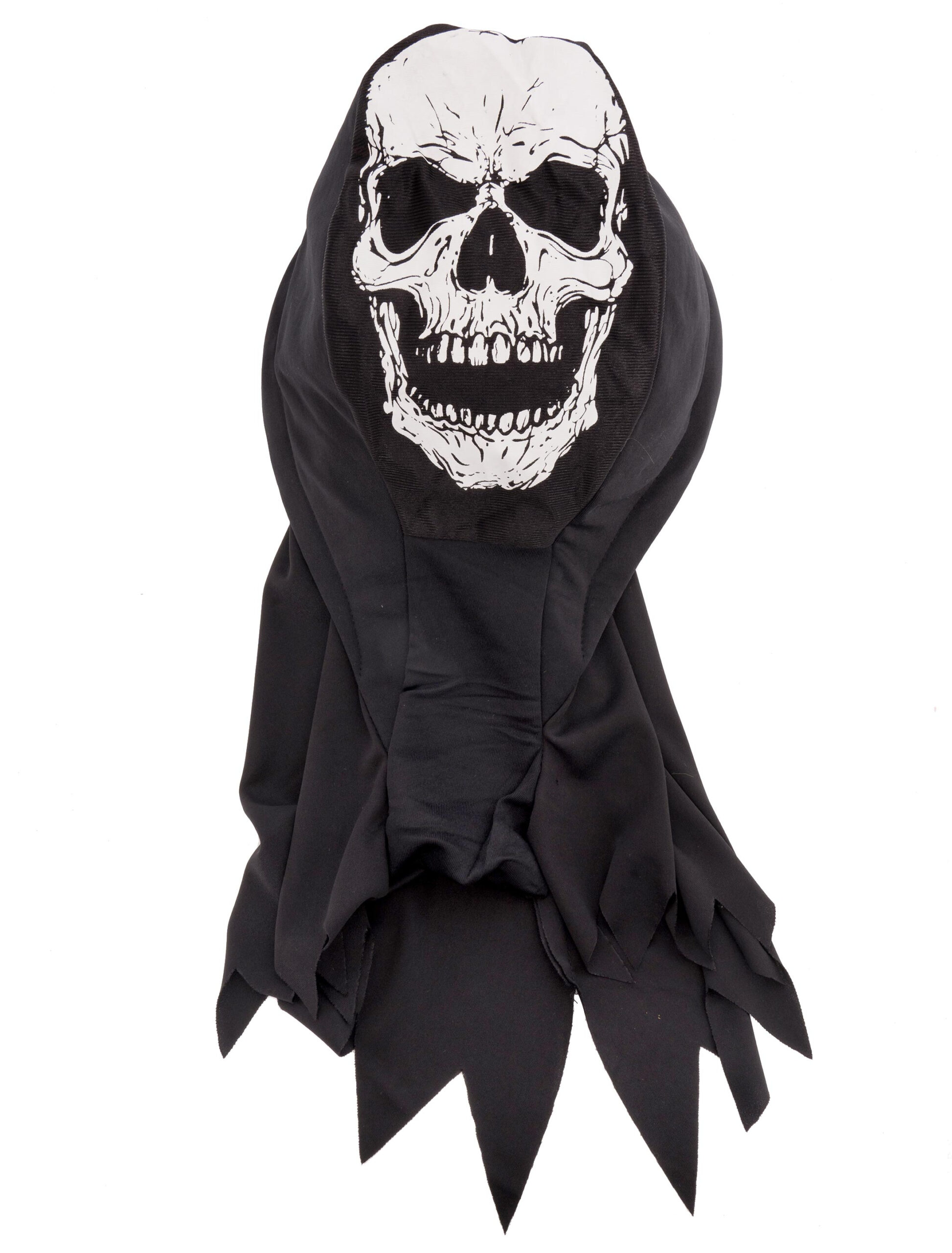 Ob an Karneval oder an Halloween: Diese schwarze Mütze mit der Maske auf der ein Skelettschädel abgebildet ist, macht Deinen Auftritt als Skelett komplett. Es ist natürlich auch möglich, eine einfache Verkleidung zu wählen und lediglich die Mütze mit der Skelett-Maske anzuziehen. Als Haube kann diese Maske einfach über den Kopf gezogen werden. Gefertigt ist die Mütze aus Polyester.