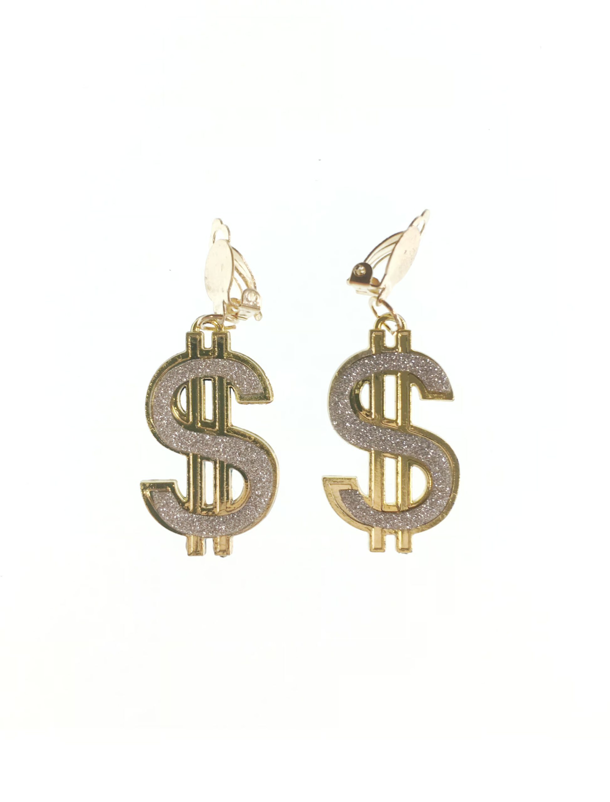 Einmal im Jahr möchtest Du richtig auftragen! Das gelingt Dir mit diesen außergewöhnlichen Ohrringen im Nu: Die beiden Ohrclips bestehen aus jeweils einem goldfarbenen und glitzernden Dollarzeichen, das perfekt zu Gangster- oder Bankräuber-Kostümen passt. Aber auch zu schickeren Verkleidungen sind diese Dollar-Ohrringe ein extravaganter Hingucker. Und das Beste ist: Du benötigst nicht einmal Ohrlöcher zum Tragen dieser Klunker!