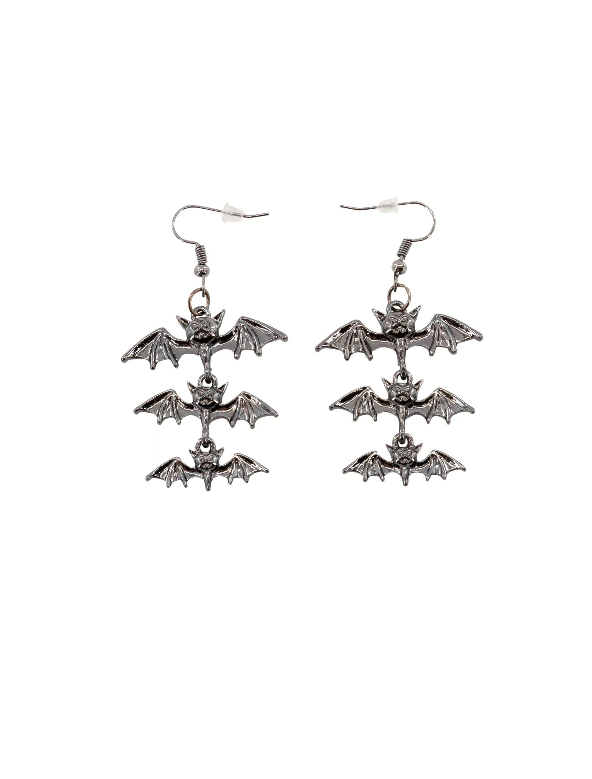 Fledermäuse kann man nie genug haben! Diese Ohrringe stellen die perfekte Ergänzung für jedes Vampir-, Fledermaus-, Hexen- oder Gothic-Kostüm dar. Jeder der beiden dunkelsilberfarbenen Ohrringe besteht aus drei miteinander verbundenen, schwarzen Fledermäusen. Ein Must-have für alle, die schaurig-schöne Verkleidungen und Halloween lieben!