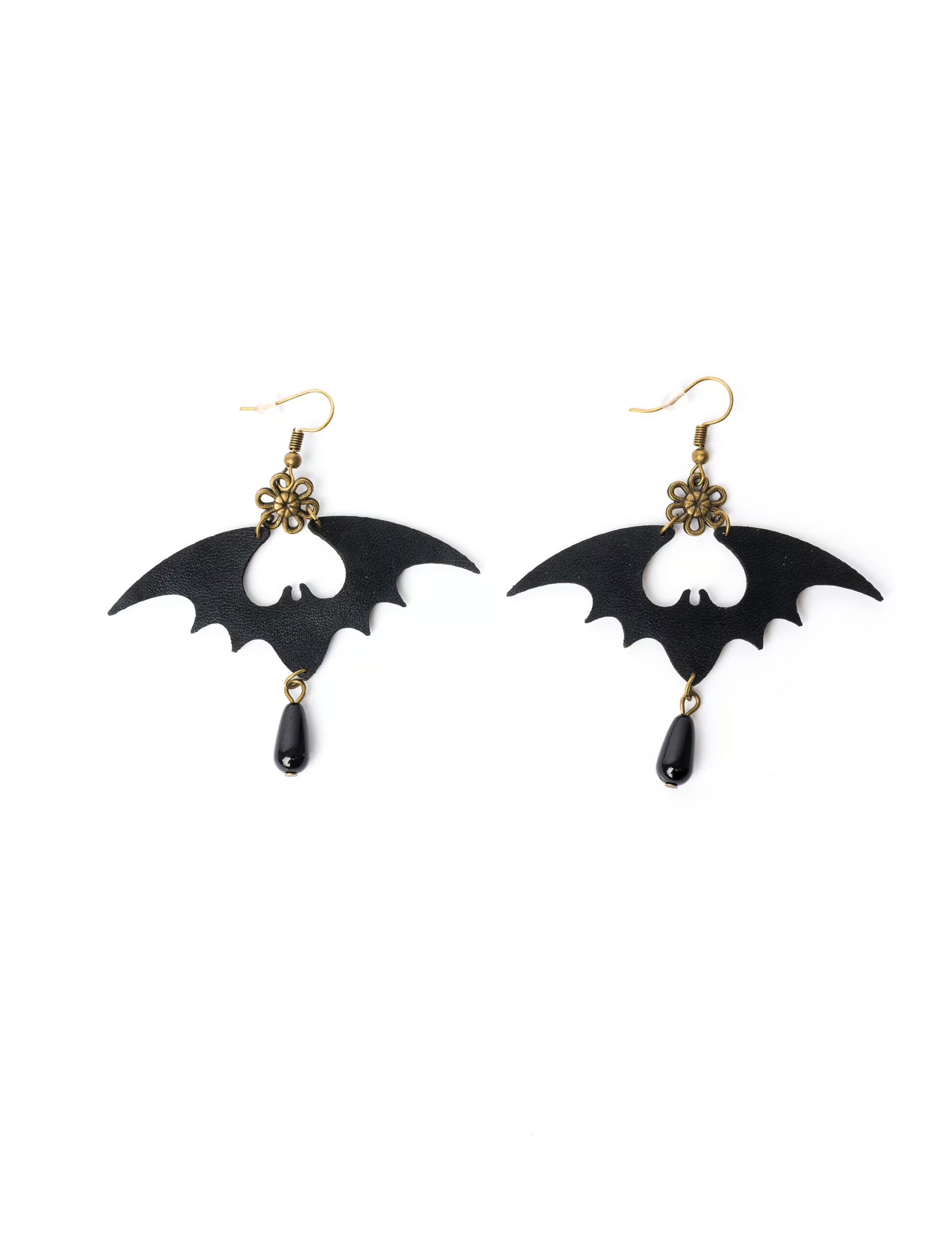 Ob zu Halloween, Fasching oder im Alltag, mit diesen eleganten Ohrringen liegst Du richtig. Sie sind sieben mal fünf Zentimeter groß und bestehen zu 100% aus Kunstleder. Über den Fledermäusen ist jeweils eine schmückende Blume in goldener Farbe. Unter ihnen baumelt ein tropfenförmiger Anhänger. Für die Ohrringe brauchst Du Ohrlöcher. Diese verspielten Schmuckstücke sind ein echter Hingucker zu jedem schaurigen Fledermaus Kostüm.