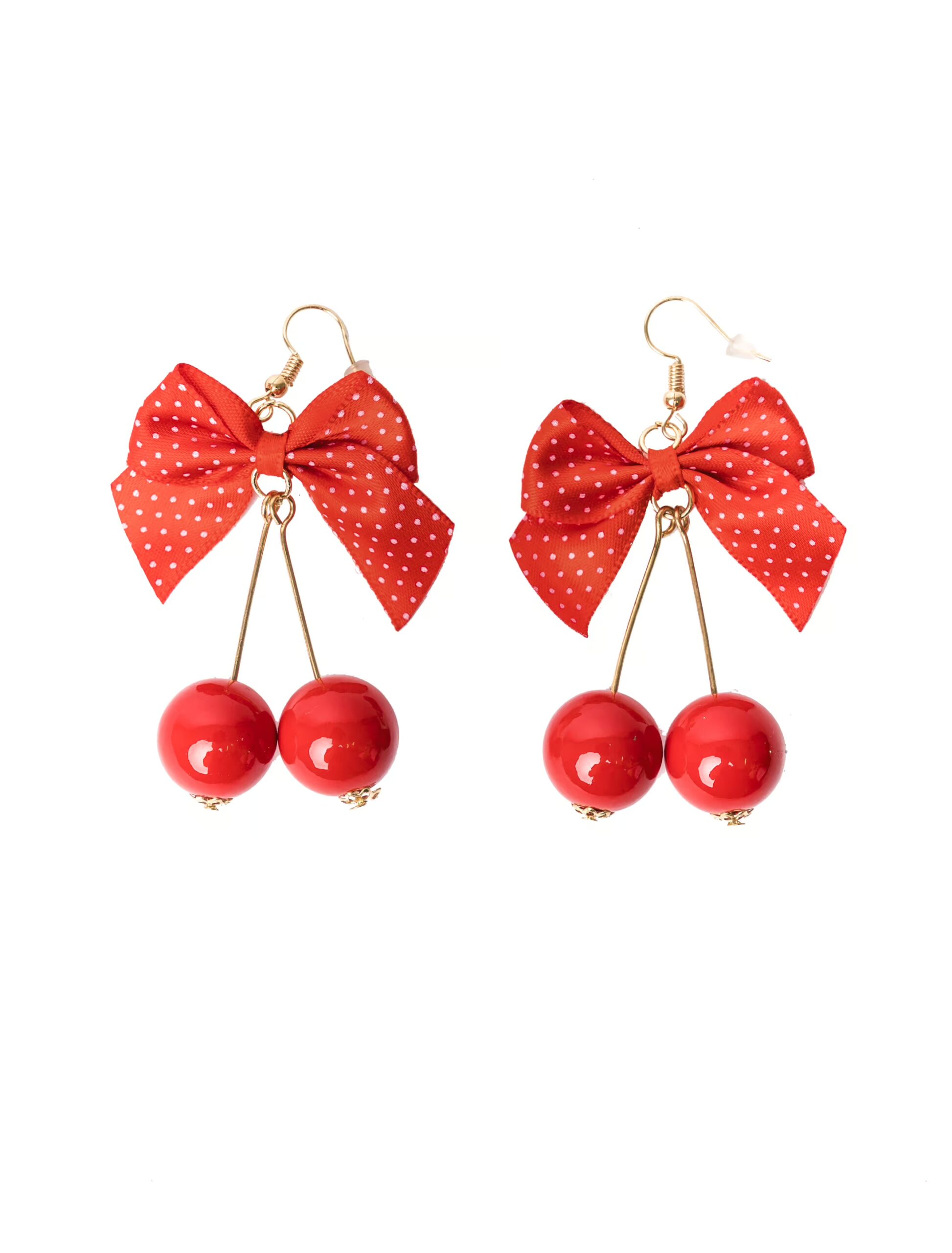 Mit diesem knallroten Ohrringen setzt Du Deine Ohren gekonnt in Szene. Die jeweils zwei Kirschen sind mit goldfarbenen Stielen an einer gepunkteten Schleifchen befestigt und schwingen so schön mit, wenn Du auf der kommenden Motto- oder Karnevalsparty Dein Tanzbein schwingst. Ein tolles Accessoire, das jedem Vintage- und 50er-Jahre-Kostüm seine persönliche Note verleiht!