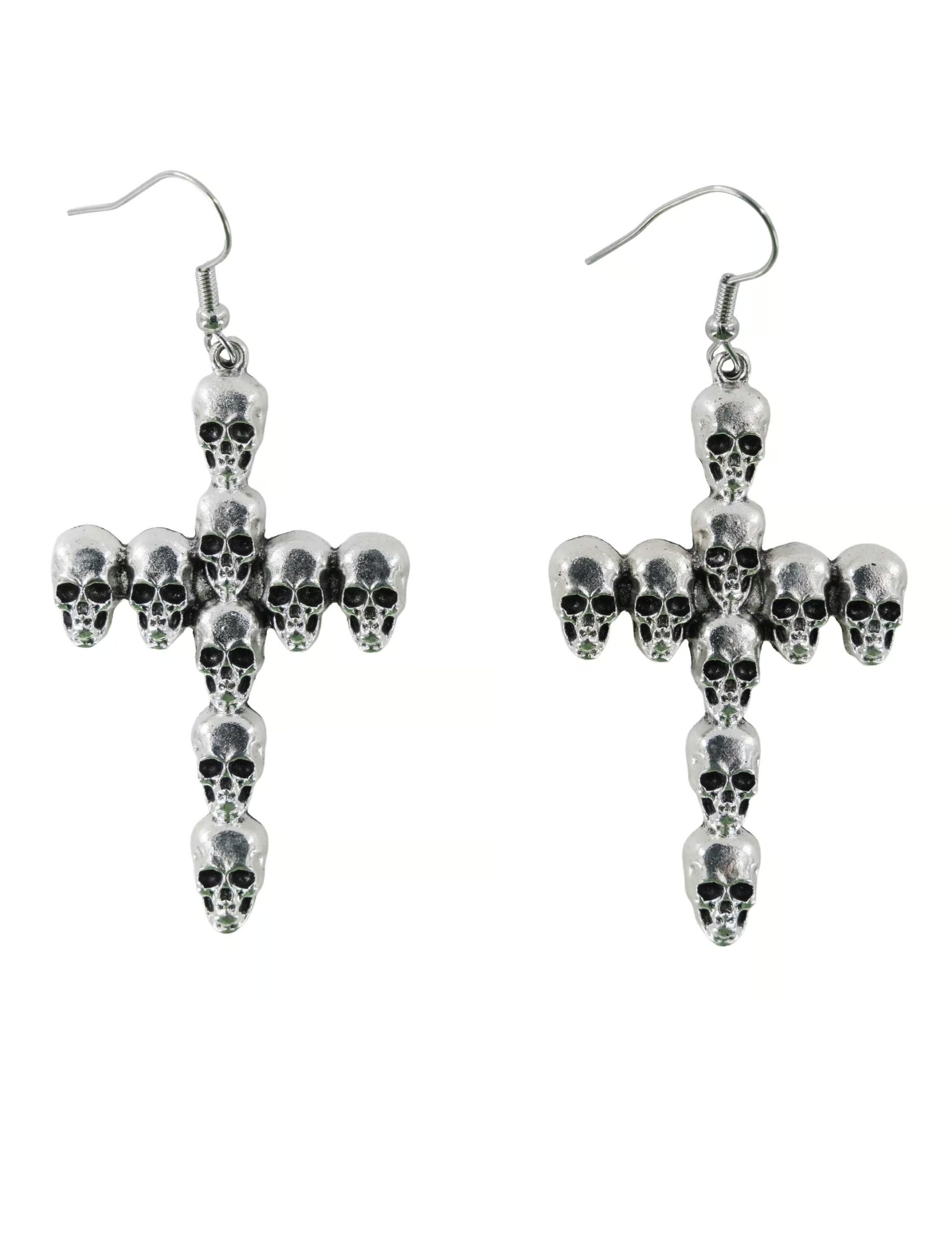 Kostümzubehör Ohrringe Kreuz mit Totenköpfen silber