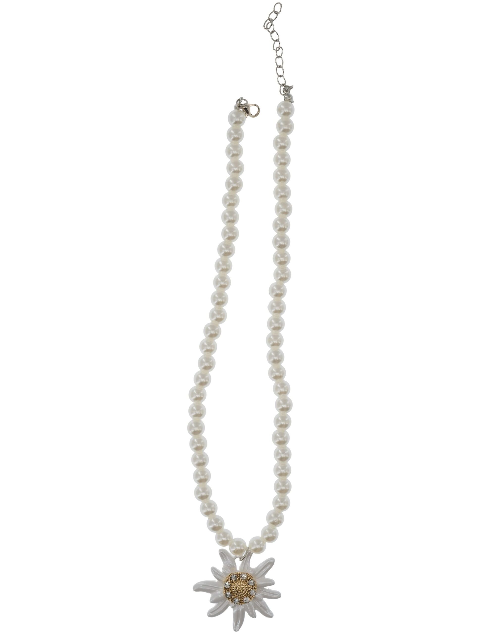Mit unserer Perlenkette mit Edelweiß Anhänger für Damen kombinierst du klassische Eleganz mit einem Hauch alpiner Romantik. Die feinen Perlen reihen sich harmonisch aneinander und verleihen der Kette eine zeitlose Ausstrahlung. Im Mittelpunkt steht der Edelweiß Anhänger, liebevoll gestaltet und mit mehreren funkelnden Schmucksteinen besetzt – ein edler Blickfang mit traditionellem Charme. Ob zum Dirndl, zum festlichen Outfit oder als stilvolles Accessoire im Alltag – diese Kette ist die perfekte Ergänzung für alle, die Schmuck mit Persönlichkeit tragen möchten!