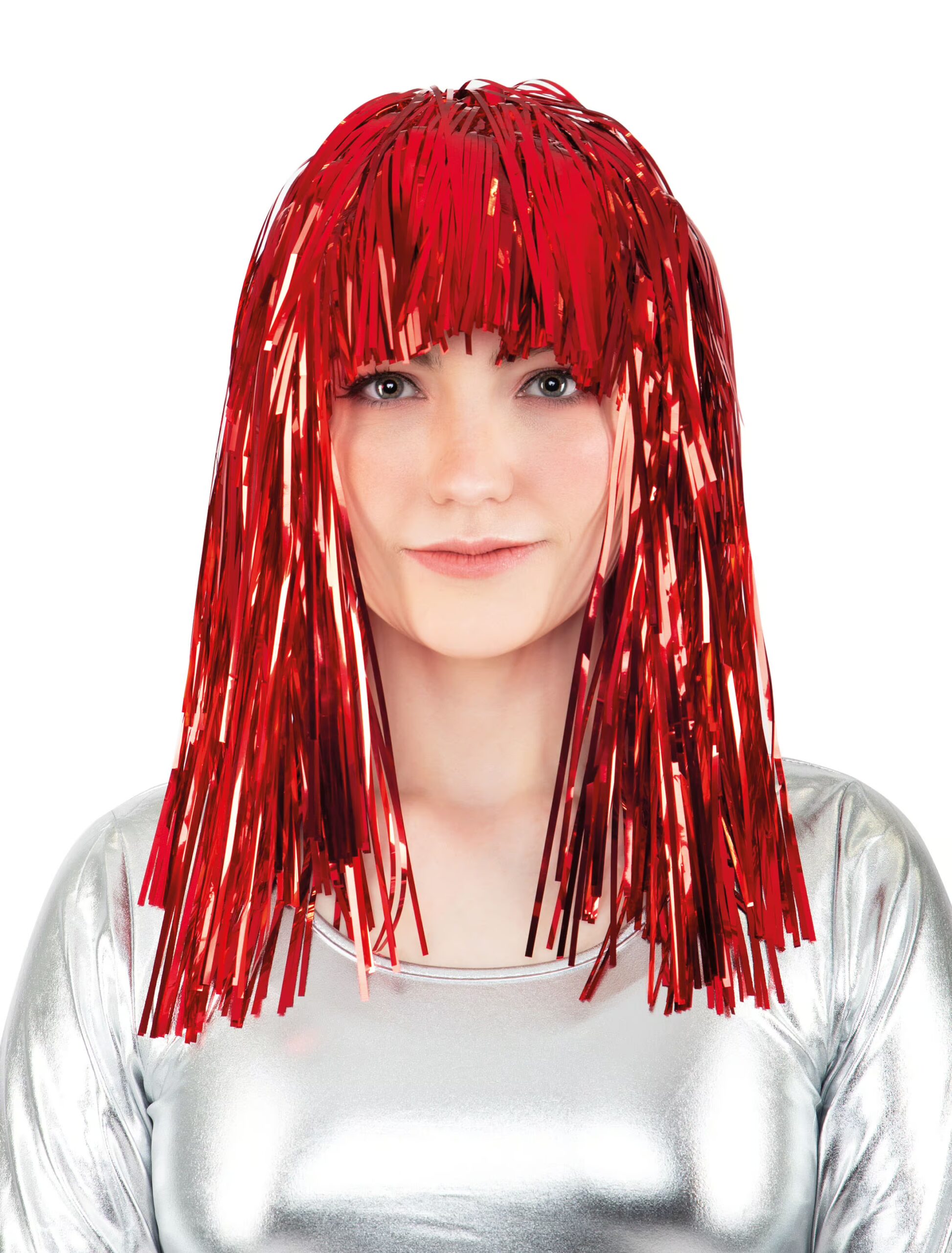 Mit unserer Lametta Perücke in Metallic Optik wirst du garantiert zum funkelnden Highlight jeder Party. Die glänzenden Strähnen fallen wie ein Wasserfall aus purem Glamour über deine Schultern und reflektieren das Licht besser als jede Discokugel. Ob Karneval, Silvester oder einfach nur, weil du der Star des Abends sein willst – diese Perücke bringt die richtige Portion Bling-Bling mit!