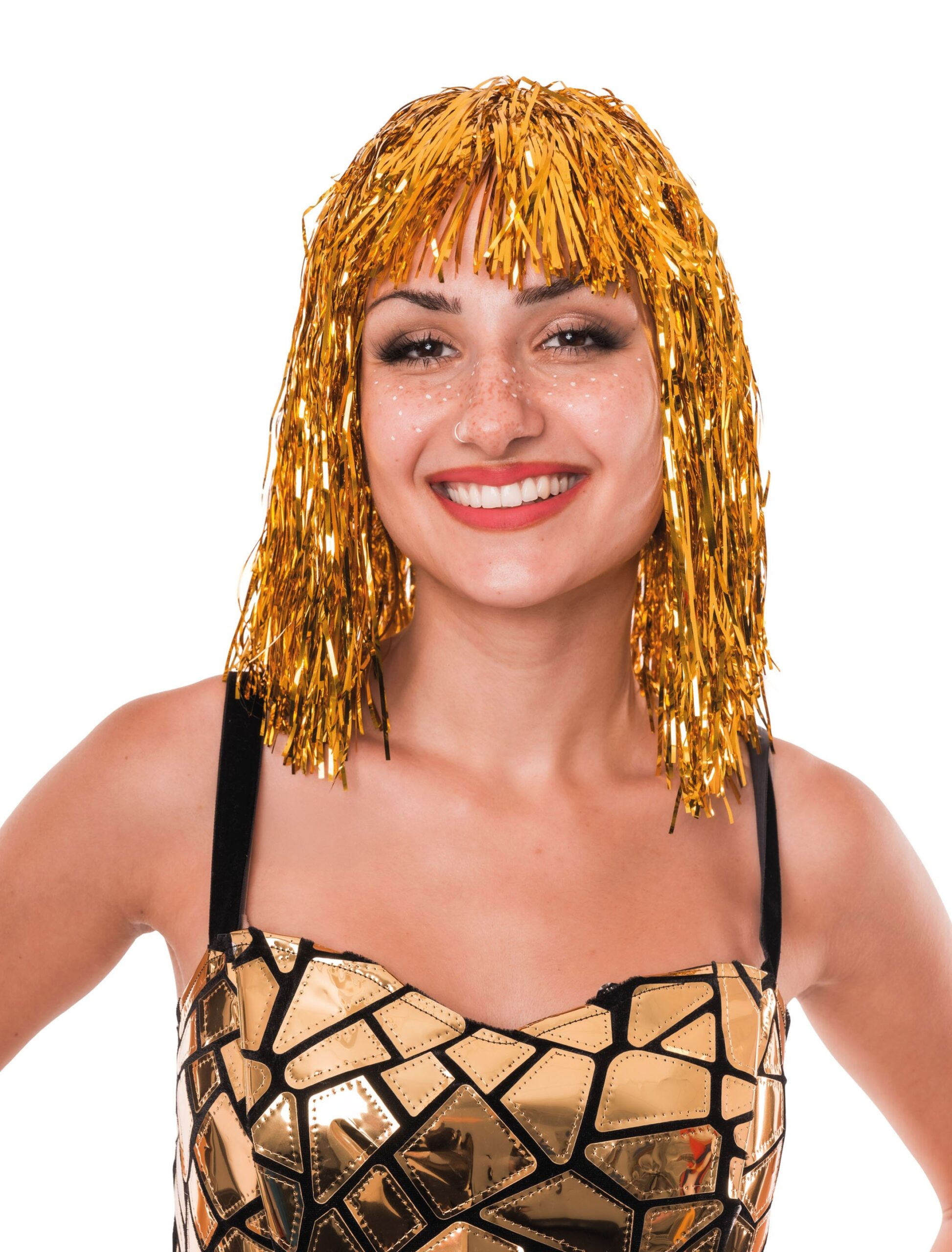 Funkelnd, auffällig, unverwechselbar – unsere Lametta Perücke mit Pony macht dich zum strahlenden Mittelpunkt. Die langen, glänzenden Fransen bewegen sich bei jedem Schritt und reflektieren das Licht in alle Richtungen. Der Pony sorgt dabei für einen frechen Look, der perfekt zu ausgelassenen Feiern, Karneval oder Show-Auftritten passt.