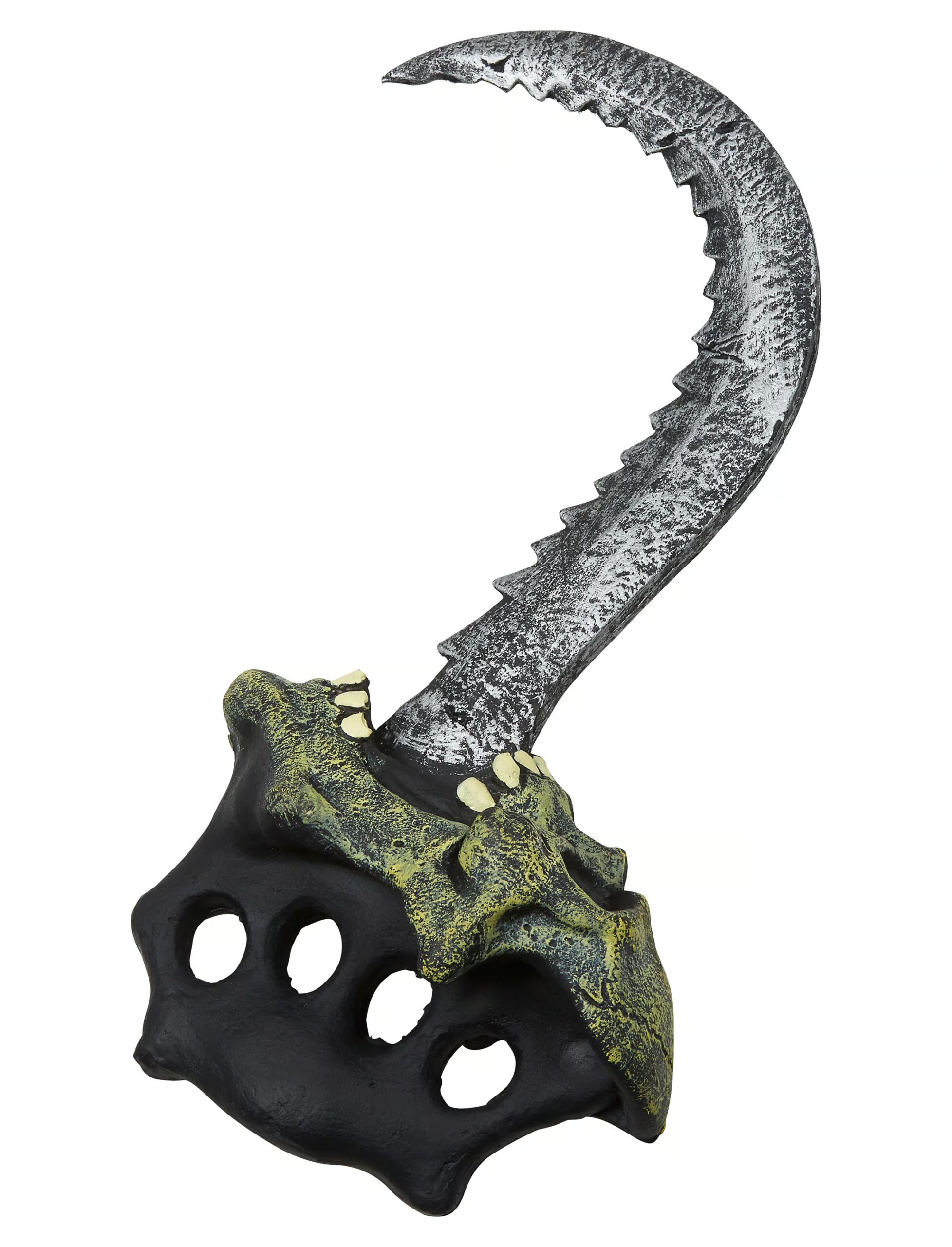 Hierbei handelt es sich um ein besonders ausgefallenes Modell der Kategorie Piratenhaken: Er ragt aus dem Maul eines verwesenden Totenkopfes. Durch seine Zacken ist er besonders beliebt bei Zombie-Piraten und -Piratinnen. Daher ist er perfekt für Deine Halloween-Party! Auch die Handhabung ist denkbar einfach, indem mit den Fingern durch die vier Öffnungen gegriffen wird.