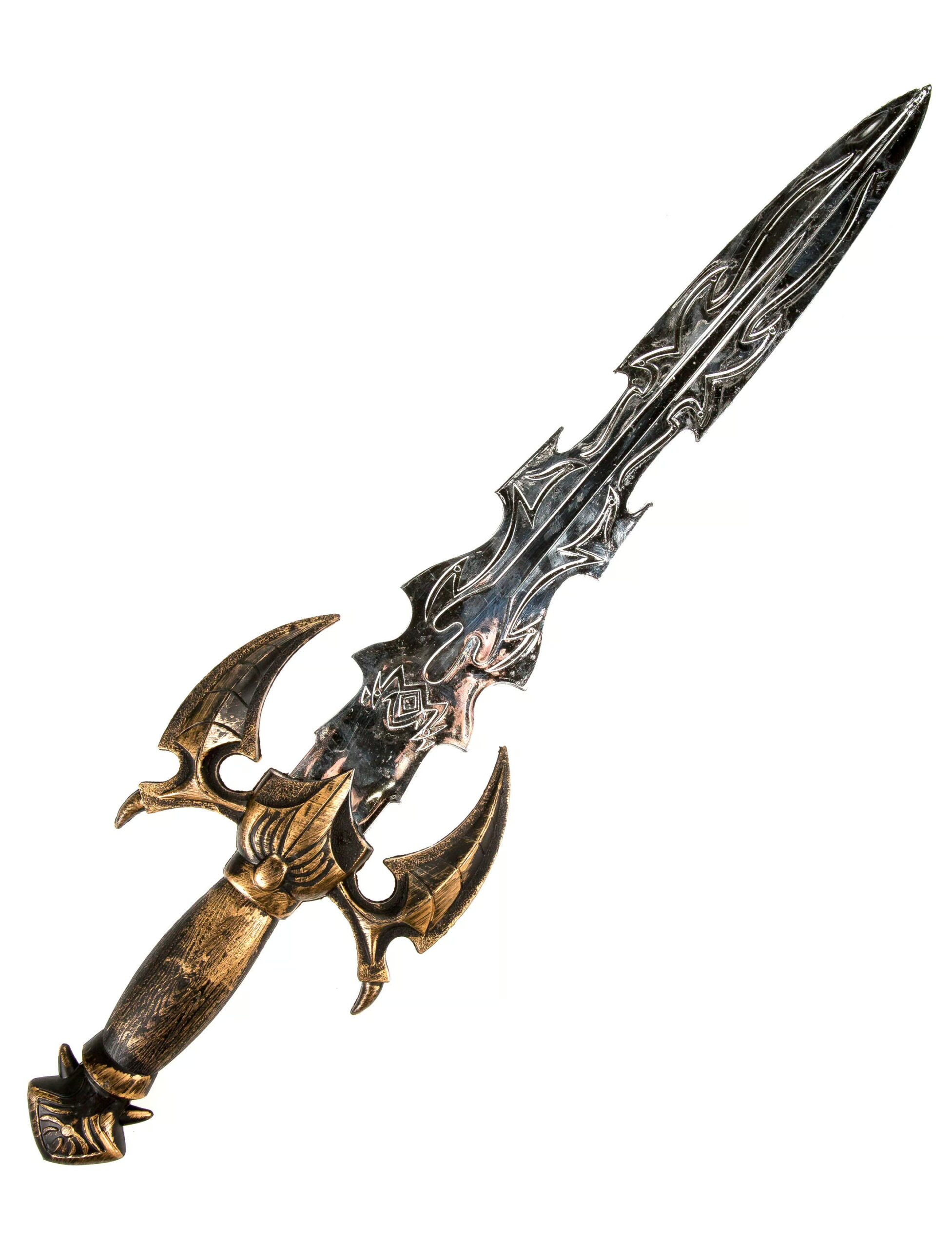 Dieses Accessoire macht Dein Ritter- oder Mittelalter-Kostüm perfekt. Das lange Schwert besitzt einen verschnörkelten, goldenen Griff und eine silberfarbene, gezackte Klinge, die beide sehr aufwendig verziert sind. Dadurch wirkt das Ritterschwert besonders antik und sehr authentisch.