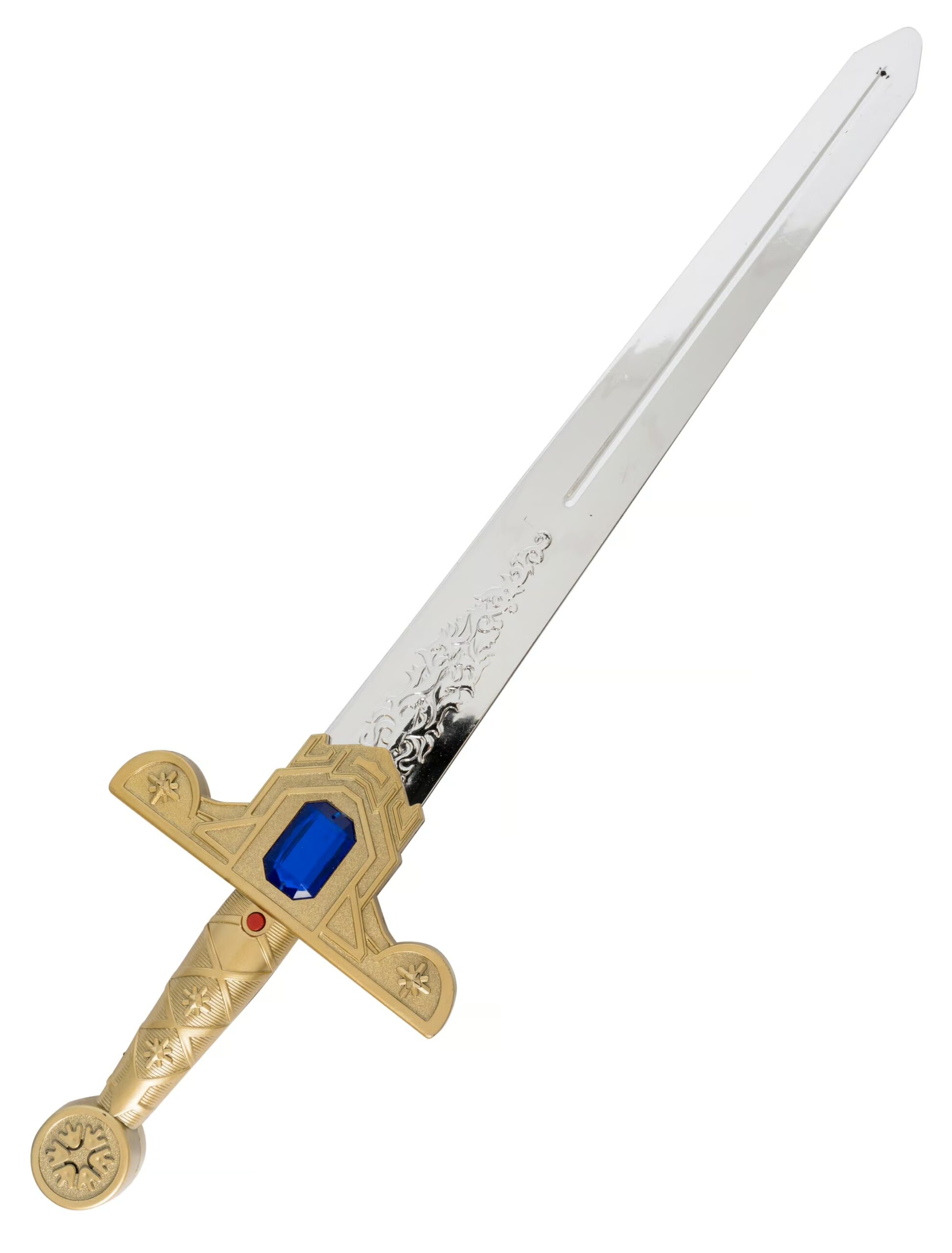 Mit diesem wundervollen Ritter-Schwert inklusive Knopfzellen-Batterien wird die Ritterrüstung Deines kleinen Ritters erst so richtig komplett. Das auffällige Schwert mit dem goldenen, elegant gearbeiteten Griff, dem großen blauen, geschliffenen Stein und der edel verzierten Klinge mit Blutrinne ist ein Highlight, das nicht nur durch seine originelle Optik beeindruckt, sondern auch durch die beiden Soundeffekte, die Dein Kind auf Knopfdruck erklingen lassen kann.