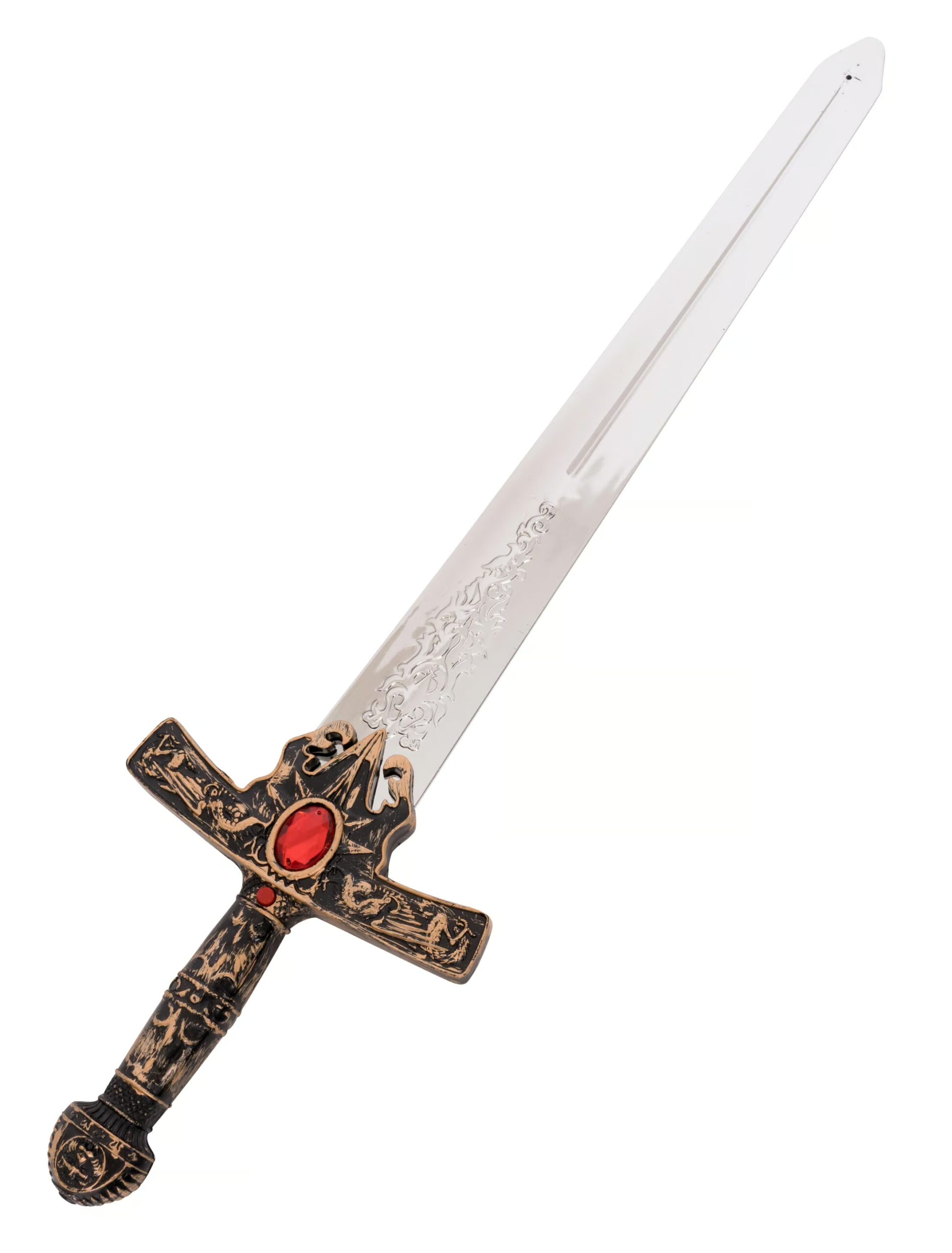 Dieses besondere Ritter-Schwert aus Kunststoff, inklusive Knopfzellen-Batterien, mit dem edlen, goldenen Griff, der schön verzierten Klinge mit Blutrinne und dem auffälligen, großen, ovalen, roten Stein ist nicht nur ein Hingucker, um den Dein kleiner Ritter beneidet wird, sondern auch das wichtigste KostümZubehör, um in der Ritterwelt zu bestehen. Neben der ansprechenden Optik sind es die Soundeffekte, die dieses Schwert so begehrenswert machen.