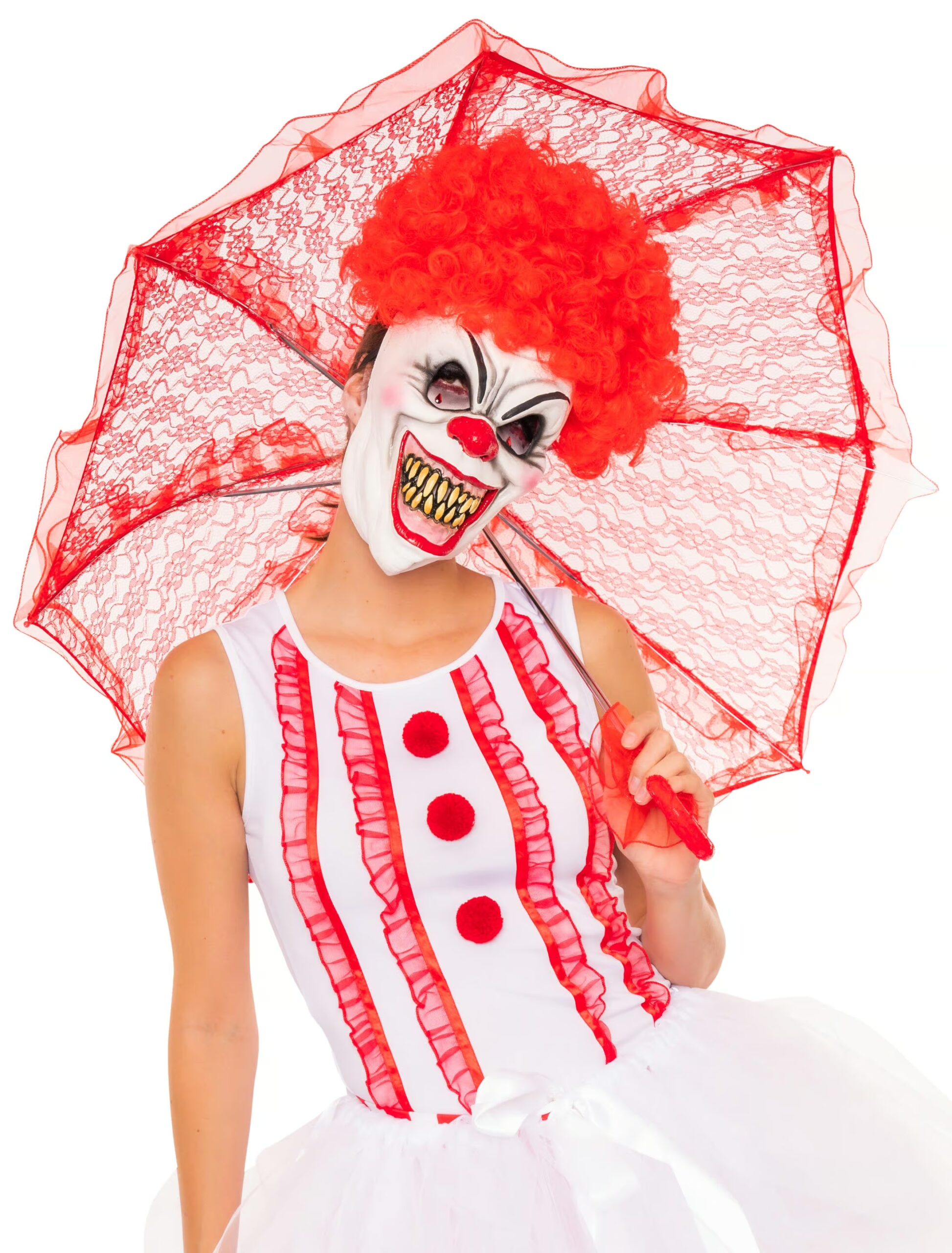 Du möchtest auf der kommenden Halloweenparty um jeden Preis auffallen? Kein Problem, denn das gelingt Dir problemlos mit diesem extravaganten Schirm. Der Schirm ist mit roter, floraler Spitze und rotem Tüll verziert. Passend dazu wird auch der rote Griff von Tüll geschmückt. Das Accessoire für Damen eignet sich hervorragend als edler Hingucker zu Grusel-Clown- und Vampir-Kostümen!