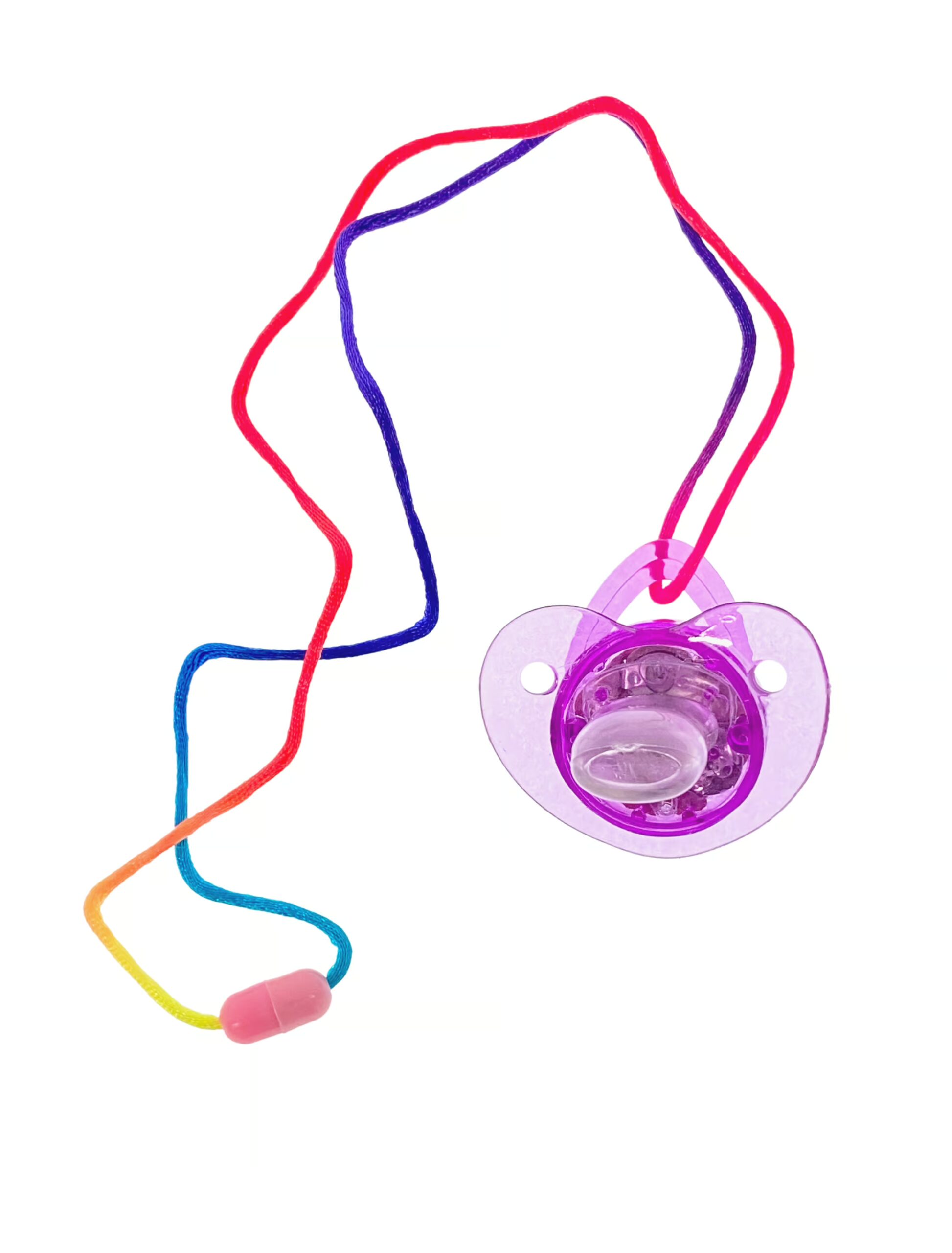 Du bist auf der Suche nach einem witzigen Accessoire für die nächste Kostümparty? Warum nicht mal eine blinkend bunte Schnullerkette tragen? Mit diesem außergewöhnlichen Zubehörartikel fällst Du garantiert auf. Der 5,5 cm große lilafarbene Schnuller aus Kunststoff blinkt bei Betätigung eines kleinen Knopfes und wird unkompliziert mit einem bunten Band um den Hals gebunden. Die Lieferung erfolgt inklusive Batterien.