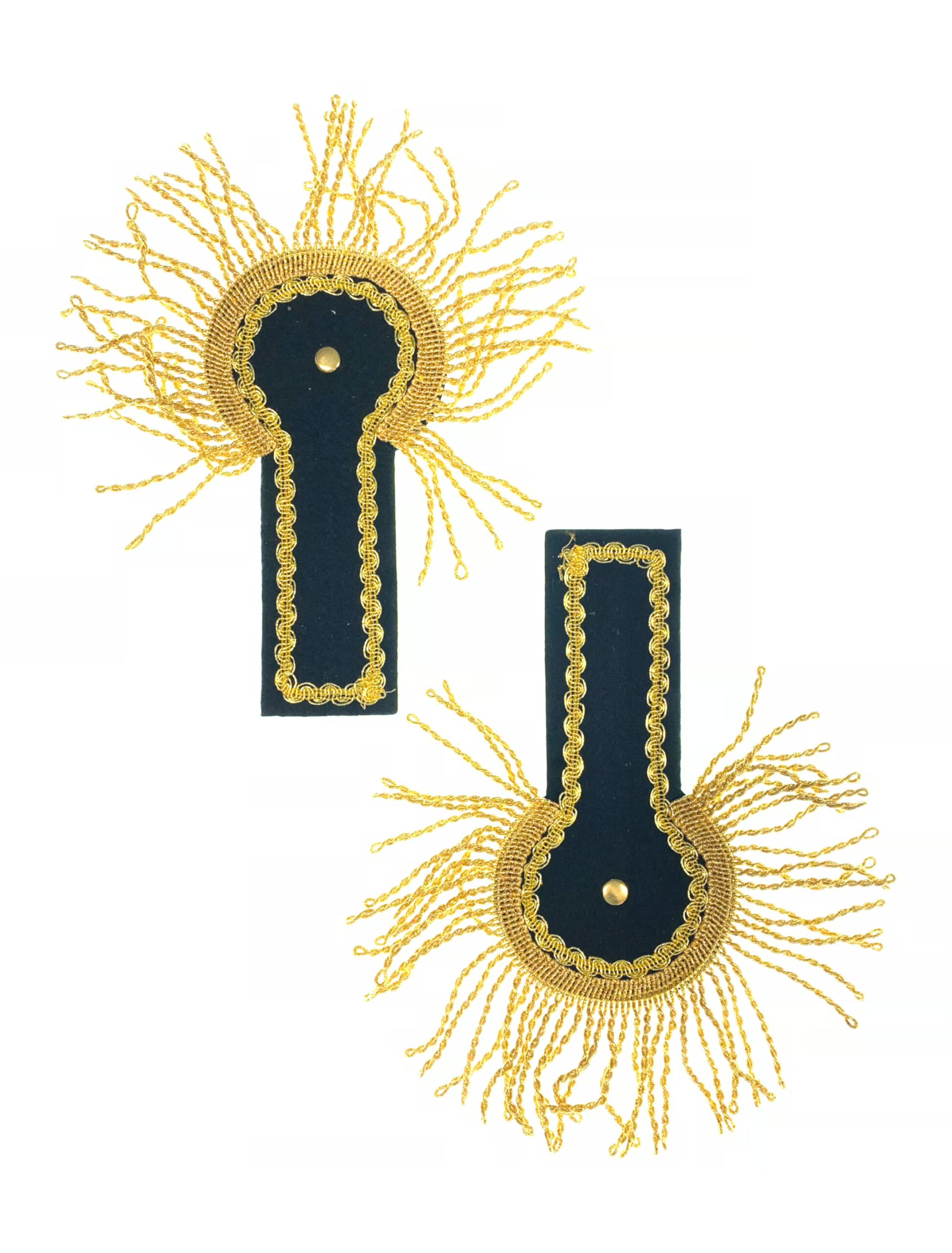 Sehr dekorativ sind diese schwarzen Schulterklappen mit den goldenen Fransen zum Aufnähen, mit denen Du Deinen KarnevalsKostümen einen interessanten und ganz eigenen Look verleihen kannst. Die schwarzen Schulterklappen sind nicht nur dekorativ mit Goldlitze verziert, sondern auch mit goldenen, gezwirbelten Fransen bestückt, die dem Accessoire einen eleganten Look verleihen. Selbst einfache Jacken, Blazer und Mäntel werden mit diesen aparten Schulterklappen zu attraktiven Hinguckern.