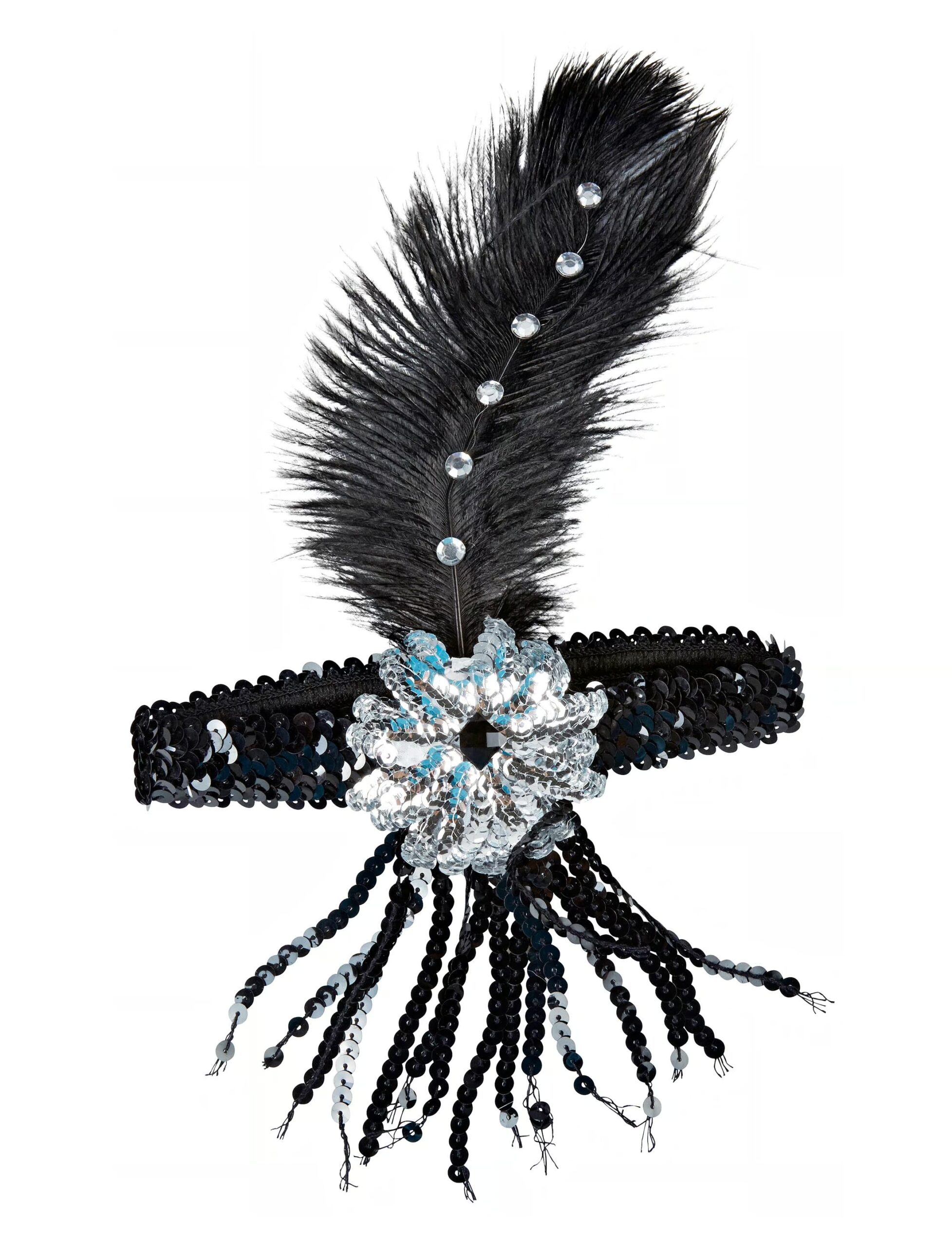 Du bist auf der Suche nach einem passenden Accessoire für Dein schickes Charleston-Outfit? Dieses schwarze Pailletten Stirnband mit einer glitzernenden Blume aus Pailletten macht Dein Outfit komplett. Geschmückt wird das Stirnband noch mit einer Feder und Bändern. Das Stirnband besteht aus 100% Polyester. Ein schöner Kopfschmuck zu Karneval, Fasching oder zur nächsten 20er Jahre Mottoparty.