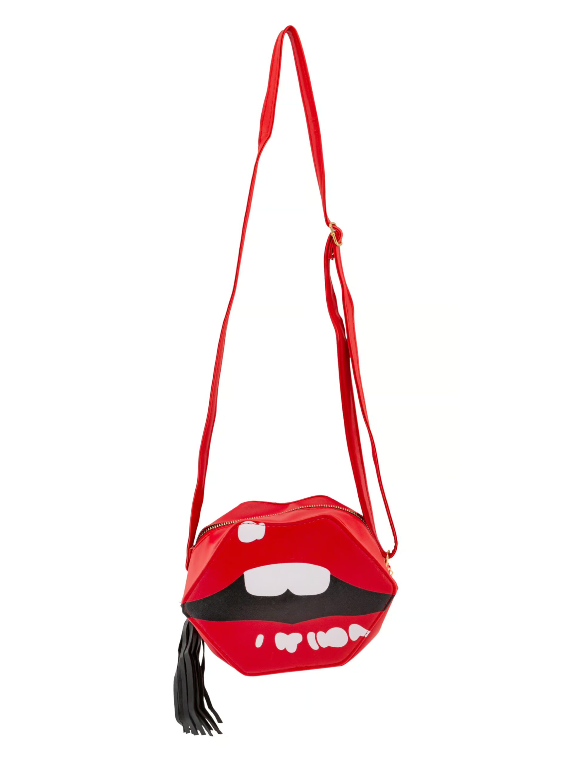 Ein echter Hingucker und ein schickes Accessoire für peppige und poppige Karnevals, Fasching- und Mottoparty Outfits oder auch für den Alltag ist unsere Tasche Mund mit Zähnen. Die rot-weiße Tasche, im Design eines leicht geöffneten Mundes mit den beiden blitzenden Zähnen und der großen, schwarzen Quaste sieht nicht nur super aus, sondern ist auch noch mit einem längenverstellbaren Schultergurt und einem praktischen Reißverschluss versehen. Ein tolles Accessoire, das zum Hinschauen verleitet!