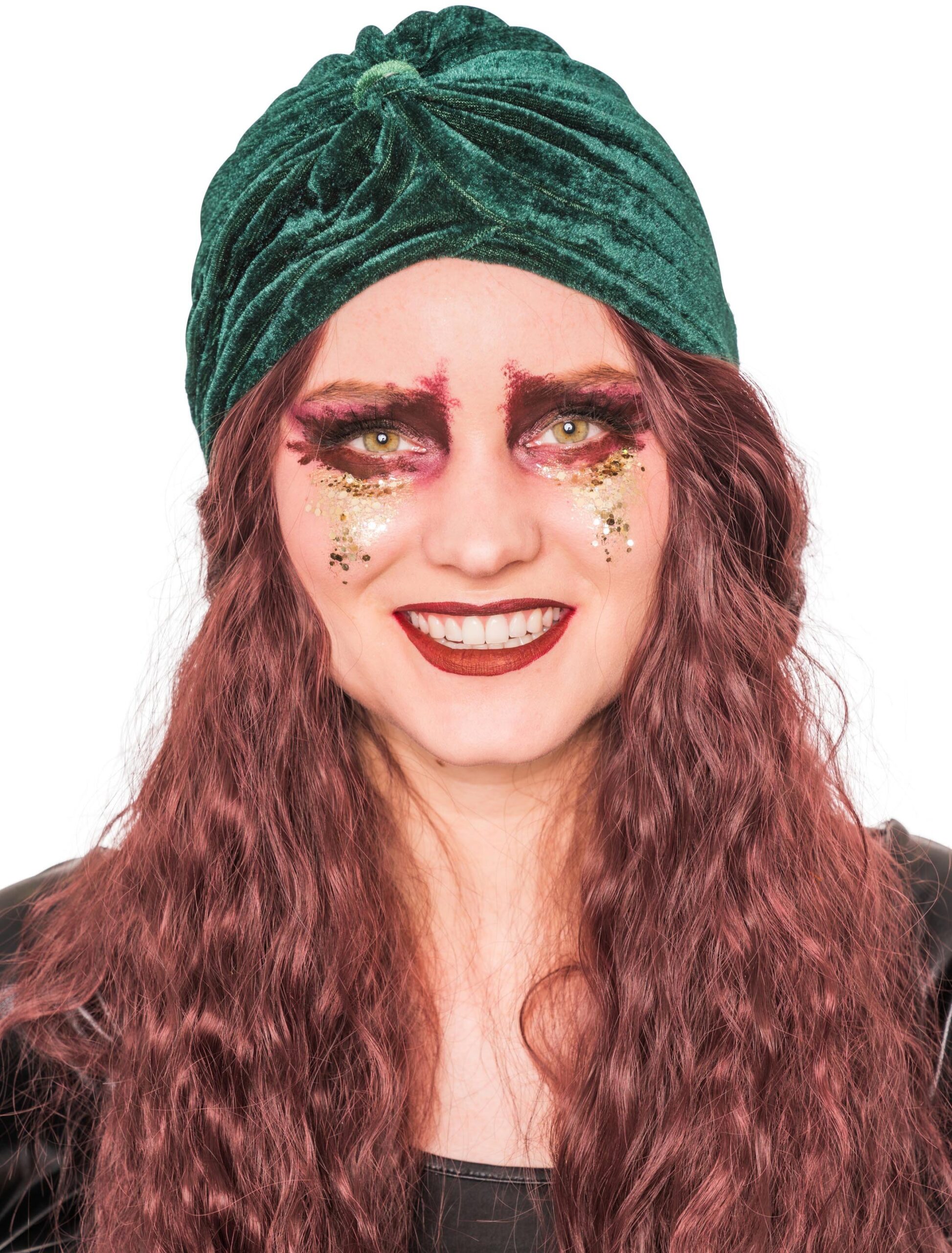 Ein wunderschönes KostümZubehör für Wahrsagerinnen und Gipsy Queens ist unser grüner Turban in edler Samt-Optik, den Du dank seiner fest vernähten Form, einfach wie eine Mütze aufsetzen kannst. Mit ihn und den mit passenden Kostümteilen aus unserem Shop kannst Du Dein eigenes Kostüm Outfit zusammenstellen und als Vagabundin, Wahrsagerin oder was immer Du sein möchtest zu Halloween, zum Fasching und Karneval sowie auf Mottopartys, den Männern den Kopf verdrehen.