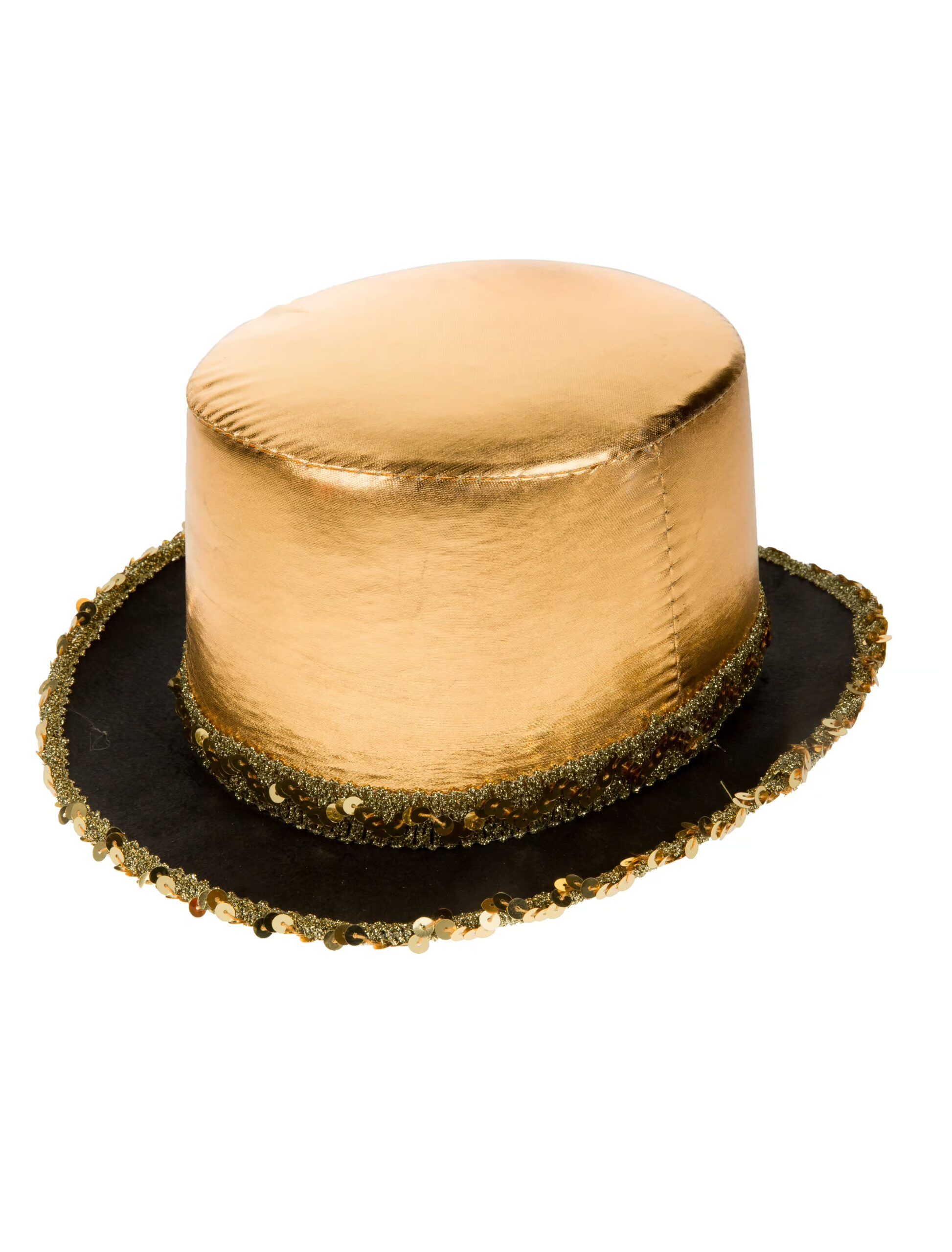 Mut zum Hut! Dieser herrliche, goldene Zylinder ist mit einem glänzenden Lamé Stoff aus Polyester gefertigt. Die Krempe ist rundherum mit glitzernden Pailletten verziert. Die goldene Kopfbedeckung lässt sich perfekt mit zahlreichen Accessoires und Kostümen aus unserem Shop kombinieren!