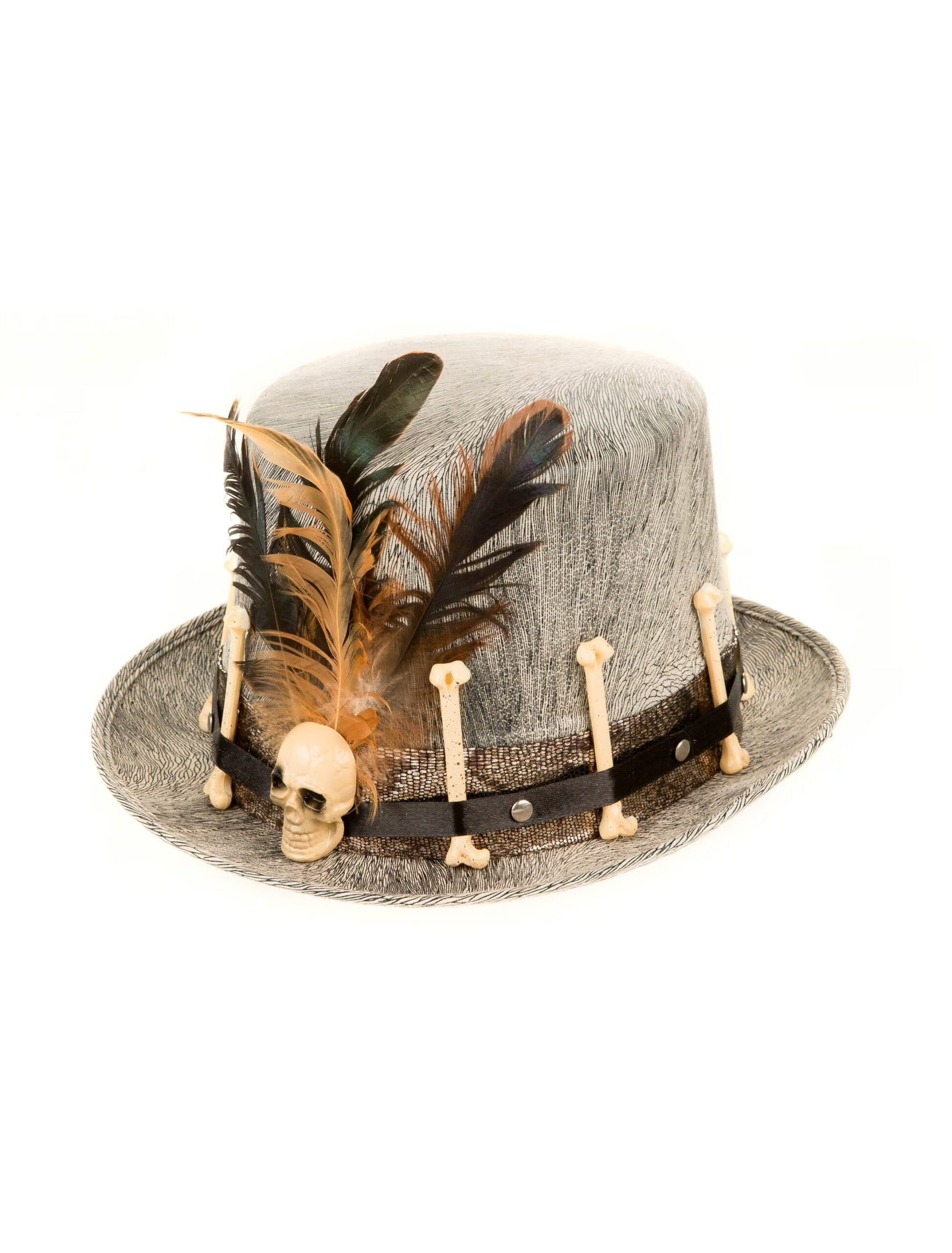 Dieser schaurig-schöne Hut ist genau die richtige Kopfbedeckung für Dein Grusel-Outfit! Der mittelhohe, graue Zylinder ist mit einem kleinen Totenschädel, Knochen und echten Federn geschmückt. Die perfekte Ergänzung für Dein Halloween- oder Karnevals-Kostüm!