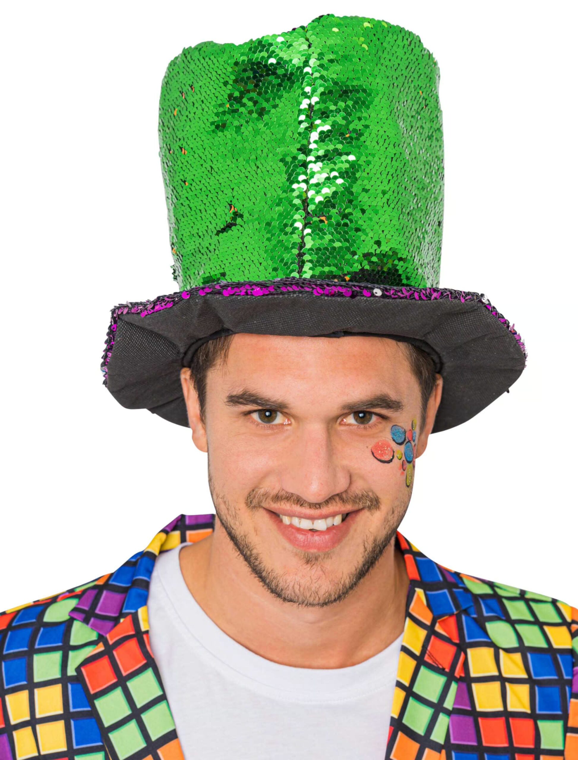 Schon von weitem ein Blickfang! Mit diesem extravaganten Hut gehst Du auf der kommenden Karnevals- oder Mottoparty garantiert nicht “verloren”. Durch die vielen grünen, goldenen und lilafarbenen Wendepailletten erstrahlst Du in jedem Licht. Ob zum Zauberer-, Magier- oder Zirkus-Kostüm, dieser auffällig große Zylinder ist das perfekte Accessoire für Deinen großen Auftritt.