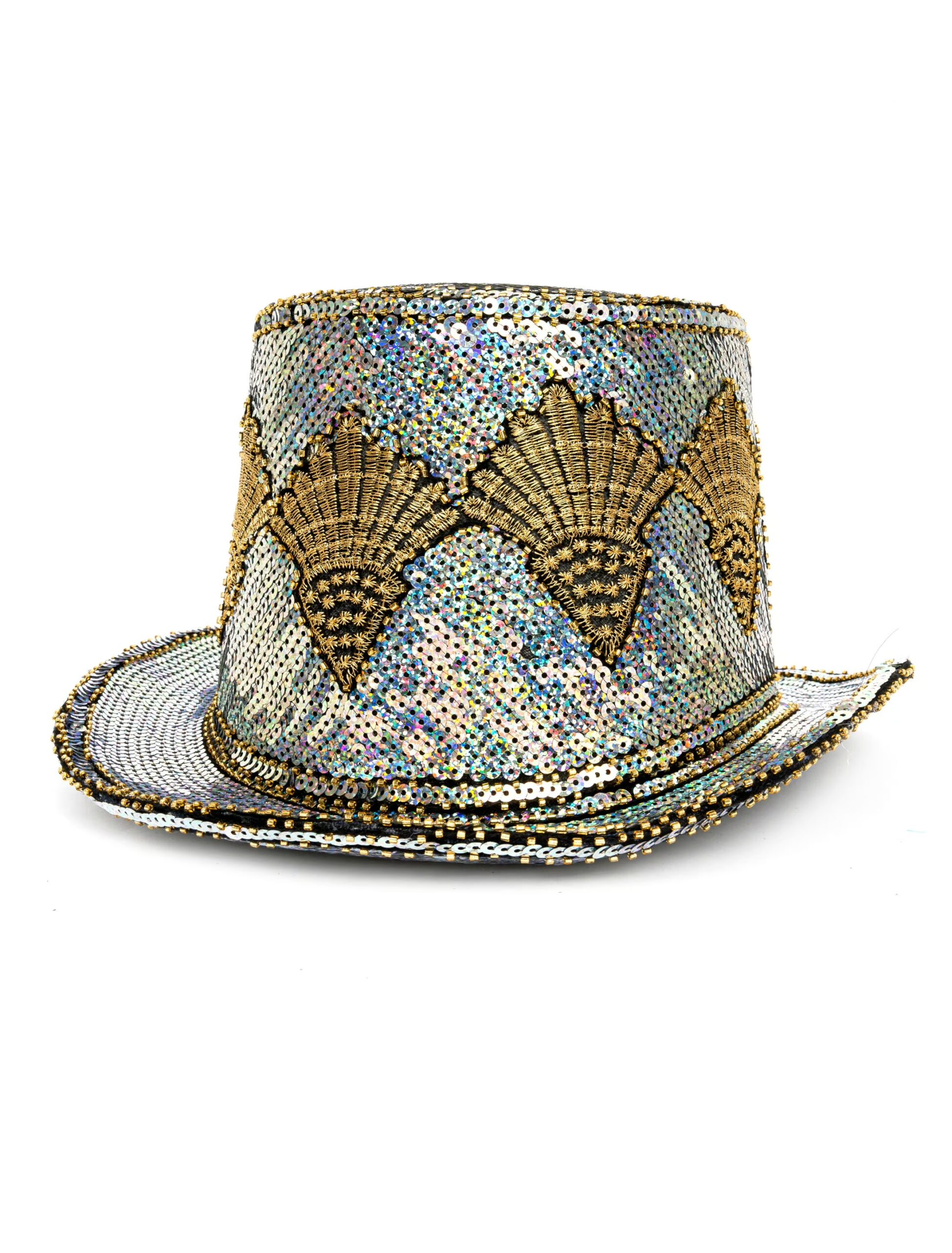 Ob zur Tanz-, Motto- oder Karnevalsparty: Mit diesem extravaganten Zylinder bist Du überall der Hingucker! Die tolle Kopfbedeckung ist rundum mit silberfarbenen Pailletten und rund um die Krone mit edlen, goldfarbenen Stickereien verziert. Zusätzlich wird der Hut an der Krempe von goldfarbenen Perlen umgeben. Bist Du bereit für einen schillernden Auftritt?