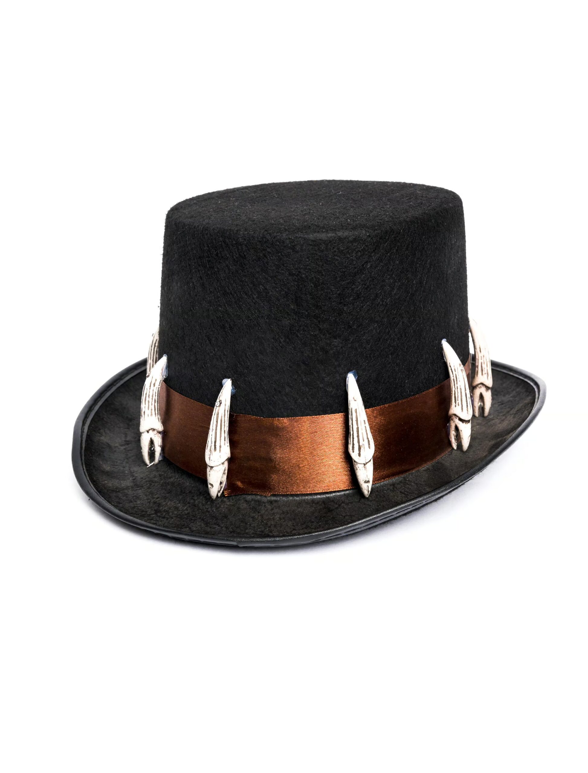 Bei diesem Zylinder muss man zweimal hinschauen! Von Weitem mag dieser edle, schwarze Hut wie eine gewöhnliche Kopfbedeckung aussehen. Doch aus der Nähe bleiben alle Blicke an ihm hängen: Kein Wunder, denn das goldfarbene Hutband und die großen Zähne, die dieses zieren, sind wahre Hingucker. Das perfekte Accessoire für Vampire, Grafen und Cowboys!