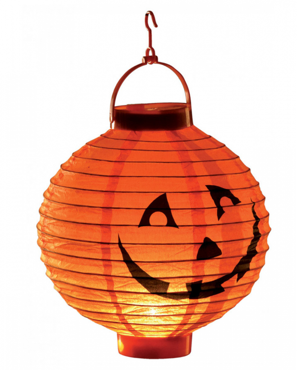 Kürbis-Laterne mit LED Die Kürbis-Laterne wird nicht so schnell Feuer fangen, sie hat ihr Licht schon eingebaut und braucht kein Feuer. Die Kürbis-Laterne mit LED ist aus orangenem Papier und hat einen Durchmesser von circa 20 cm. Sie hat vorne und hinten ein Kürbis-Gesicht. Das eingebaute LED Licht wird mit zwei AAA Batterien betrieben, die nicht mitgeliefert werden. Die Kürbis Laterne kann an einem Haken aufgehängt werden oder als Standlaterne verwendet werden. Eine mitgelieferte Stütze, die in die Laterne eingestellt wird, hält den Lampion dann auseinander gefaltet. Material: Papier, Kunststoff Farbe: Orange, Schwarz Durchmesser: ca. 20 cm