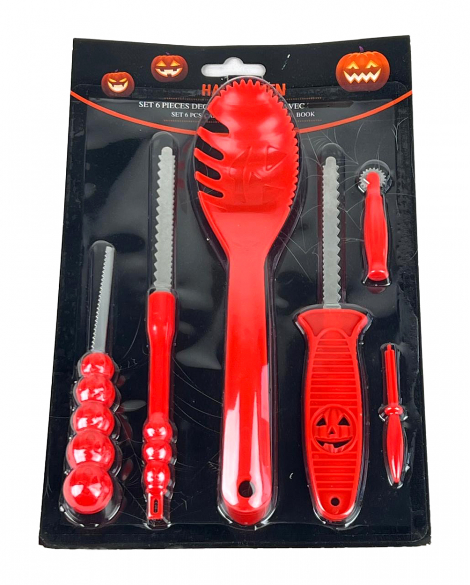 6-teiliges Kürbis Schnitz Set Der gruselig, grinsende Kürbis und Halloween sind untrennbar miteinander verbunden Tausende von Kindern basteln jedes Jahr, schaurige und gruselige Kürbis Fratzen und beleuchten dies als Laterne. Damit das Schnitzen der Kürbis-Grimassen leichter fällt, ist es unbedingt notwendig, das richtige Werkzeug dafür zu haben. Das 6 teilige Kürbis-Schnitz Set ist für den professionellen Kürbis-Schnitzer ein großer Vorteil. Mit dem genialen Kürbis Schnitzwerkzeug lässt sich aus einem einfachen Kürbis, die schaurigste Fratze und Laterne für Halloween basteln. Das Kürbis-Schnitzset beinhaltet Mastersäge, diverse feine Kontur-Sägen, Ausstecher, Sägerad und Schaufel. Lieferumfang: 1 x Kürbis Schnitz Set 6-teilig Inhalt: 3 x Sägen, 1 Kürbis Rad, 1 x Kürbis Poker, 1 x Kürbis Löffel Farbe: orange oder grün Material: Kunststoff und Metall