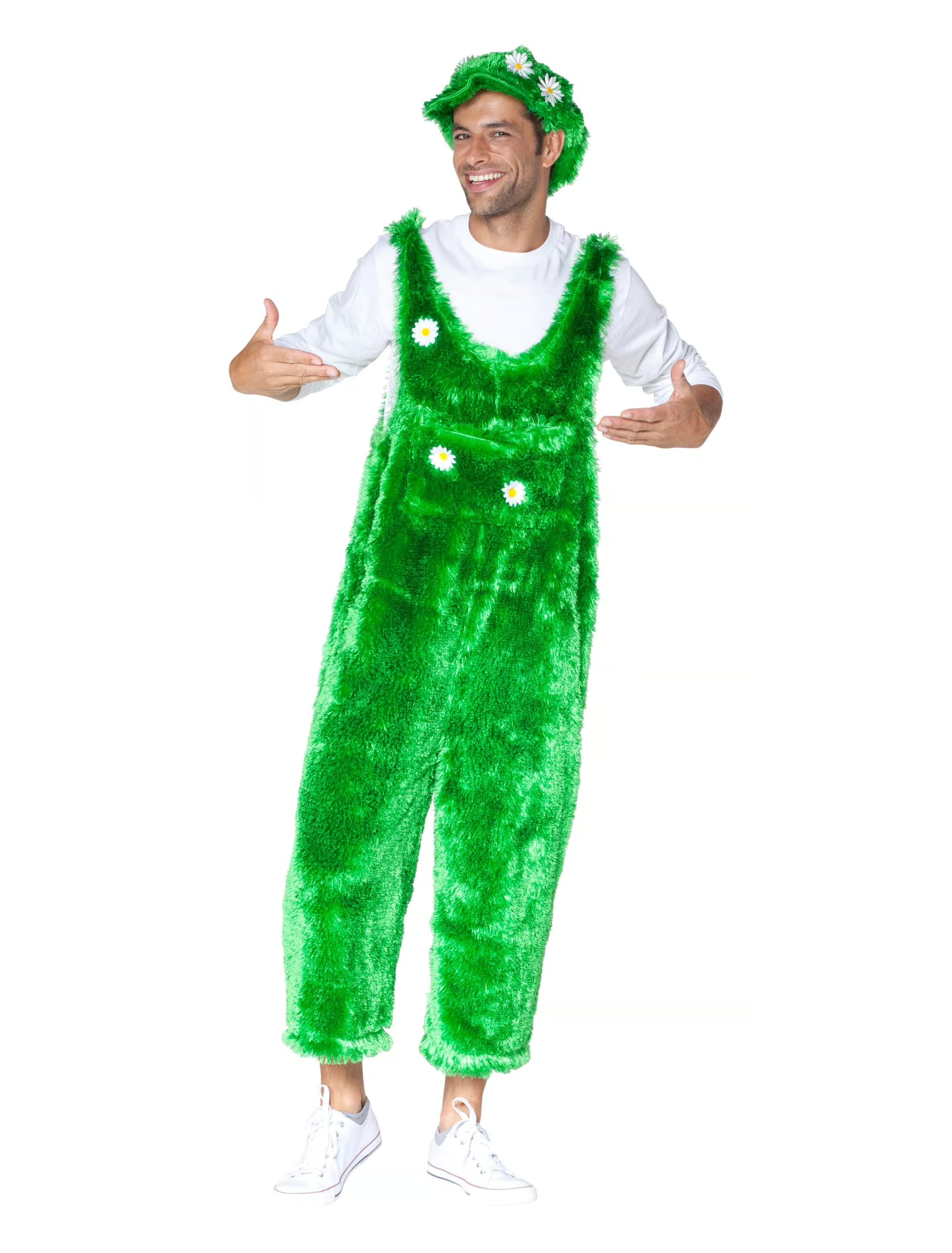 Da steht ein Mann… auf der Wiese! Oder besser: In einer Wiese! Mit diesem knallgrünen Kostüm bist Du der Blickfang auf jeder Motto-, Fasching- und Karnevalsparty. Die grüne Latzhose besteht auf der Oberfläche aus kuscheligem Stoff, der durch den fransigen Charakter wie Gras wirkt. Die Front wird von drei weißen Blumen geziert, die den Wiesen-Look vervollständigen. Die praktische Tasche im Brustbereich bietet Stauraum für persönliche Dinge. Während die Träger der Latzhose für einen perfekten Halt sorgen, verleiht der knöchellange Schnitt dem Herren Gras Kostüm Leichtigkeit. Einfach in die bequeme Latzhose reinschlüpfen und den Rasen rocken! Ein perfektes Kostüm für alle Männer, die es bequem mögen und Farbe sowie gute Laune auf jede Garten- oder Karnevals-, Fasching- oder Mottoparty bringen möchten!