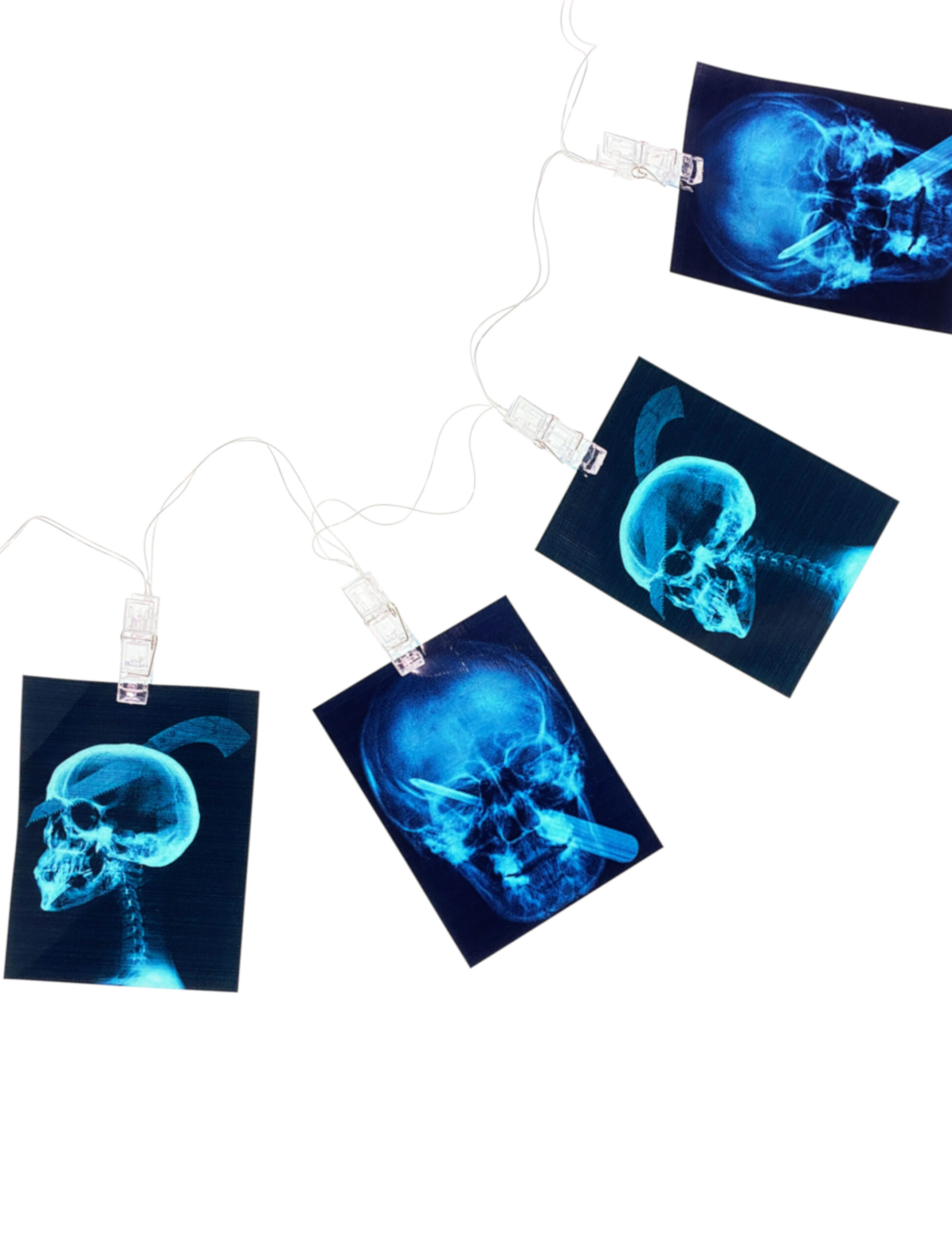 Für schauerlich schönen Gruselspaß sorgst Du mit der LED Girlande Röntgenbilder mit Schädeln, die mit Batteriefach, Ein- und Ausschalter sowie inkl. Batterien ausgestattet ein dekoratives Highlight auf Halloween-, Grusel- und Mottopartys ist. Die 160 cm lange Leuchtgirlande aus PVC besteht aus 10 täuschend echt wirkenden Röntgenbildern (12 x 16 cm) mit unterschiedlichen Schädelaufnahmen, die mittels der integrierten LED Beleuchtung für eine angemessene schaurige Gruselstimmung, gespenstische Akzente setzen.