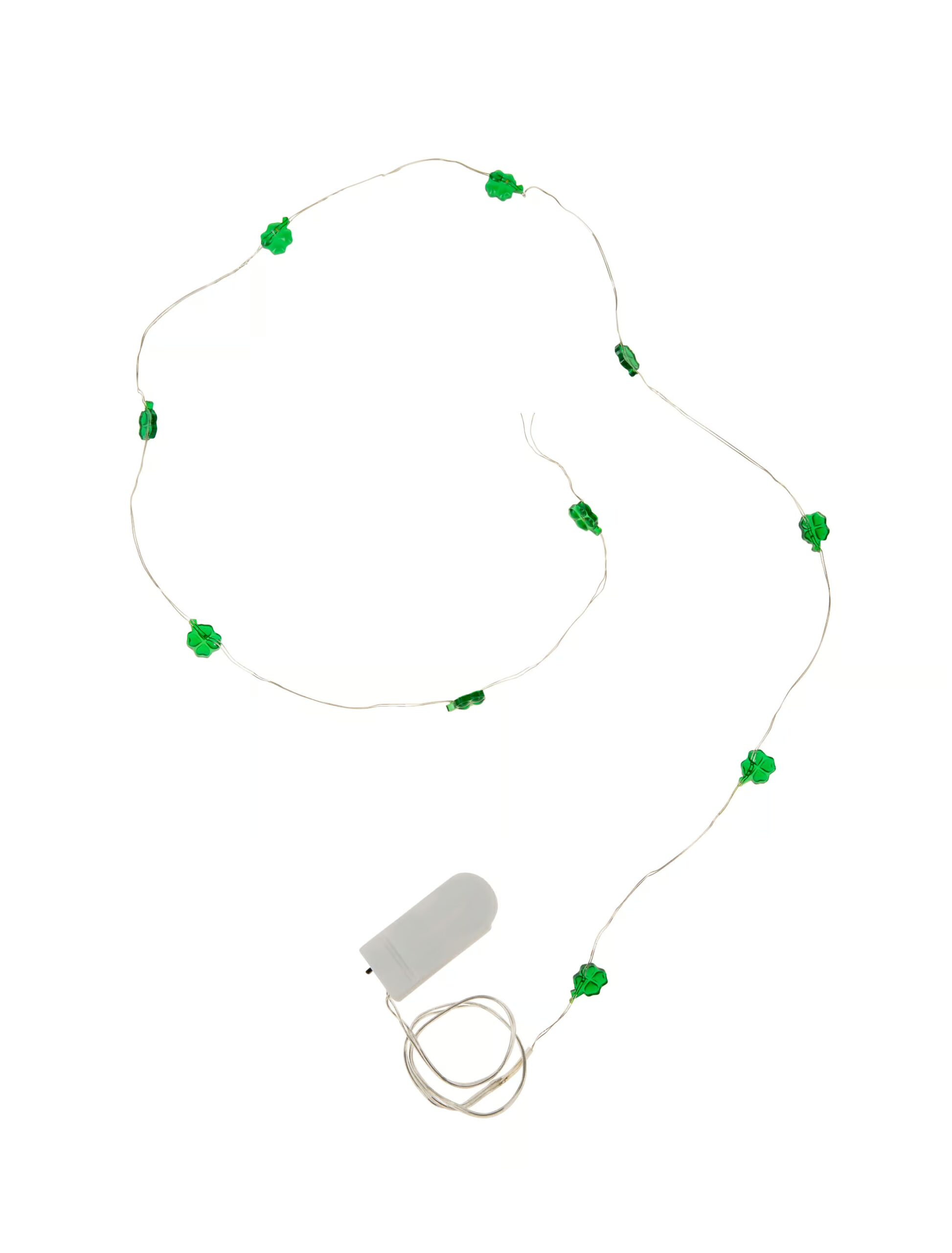 Dir fehlt noch das gewisse Etwas an Deiner St. Patricks Day-Party oder als Highlight für an Dein Kostüm? Unsere Lichterkette mit Kleeblättern darf hier nicht fehlen. Die Lichterkette hat eine Länge von 1 Meter. Die Besonderheit bei dieser LED Lichterkette Kleeblatt sind die LED-Leuchten. Bei diesem Accessoire sind Batterien enthalten. Ein echtes Highlight für Deine Party oder für Dein Kostüm! Das Produkt beinhaltet nur eine Mini-Lichterkette mit einem Ein- und Ausschalter. Micro-Lichterkette. Kleiner Tipp: Da die Lichterkette durch das Draht sehr flexibel ist, kannst Du sie ganz einfach um einen Zylinder, einen Stab oder sonstigen Zubehörteilen umwickeln. So machst Du Dein Kostüm zu etwas ganz Besonderem.