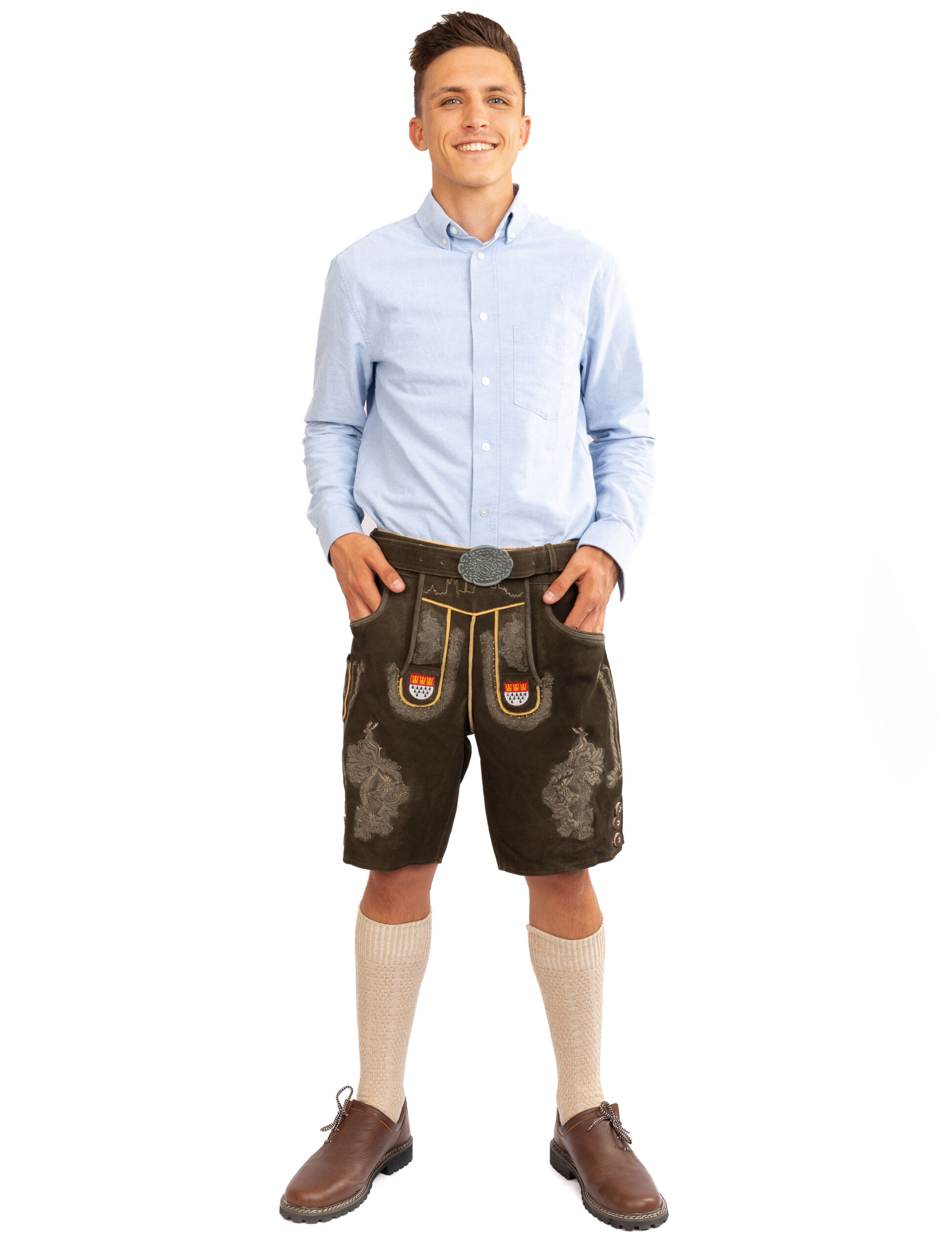 Die Lederhose Cologne vereint traditionelles Design mit kölschem Charme. Hergestellt aus hochwertigem Leder, bietet diese Hose sowohl Komfort als auch Stil. Das edle Material und die ausgezeichnete Verarbeitung sorgen für eine perfekte Passform und ein angenehmes Tragegefühl. Typische Trachtendetails wie die markanten Hornknöpfe und rustikale Stickereien an den Beinabschlüssen verleihen der Hose ihren authentischen Look. Statt eines Latzes kommt ein praktischer Reißverschluss zum Einsatz, der für zusätzlichen Komfort sorgt. Die Lederhose Cologne lässt sich dank der Schnürungen am Bund und an den Beinabschlüssen optimal anpassen. Ein Gürtel mit einer altsilbernen Hirschschnalle rundet das Design ab. Mit den kölschen Logos als Details wird eine besondere Verbindung zwischen der bayerischen und kölschen Tradition geschaffen. Ideal um an Karneval, auf dem Oktoberfest oder bei anderen festlichen Anlässen das perfekte Outfit mitzubringen. Ein vielseitiger Klassiker, der jedes Trachtenoutfit