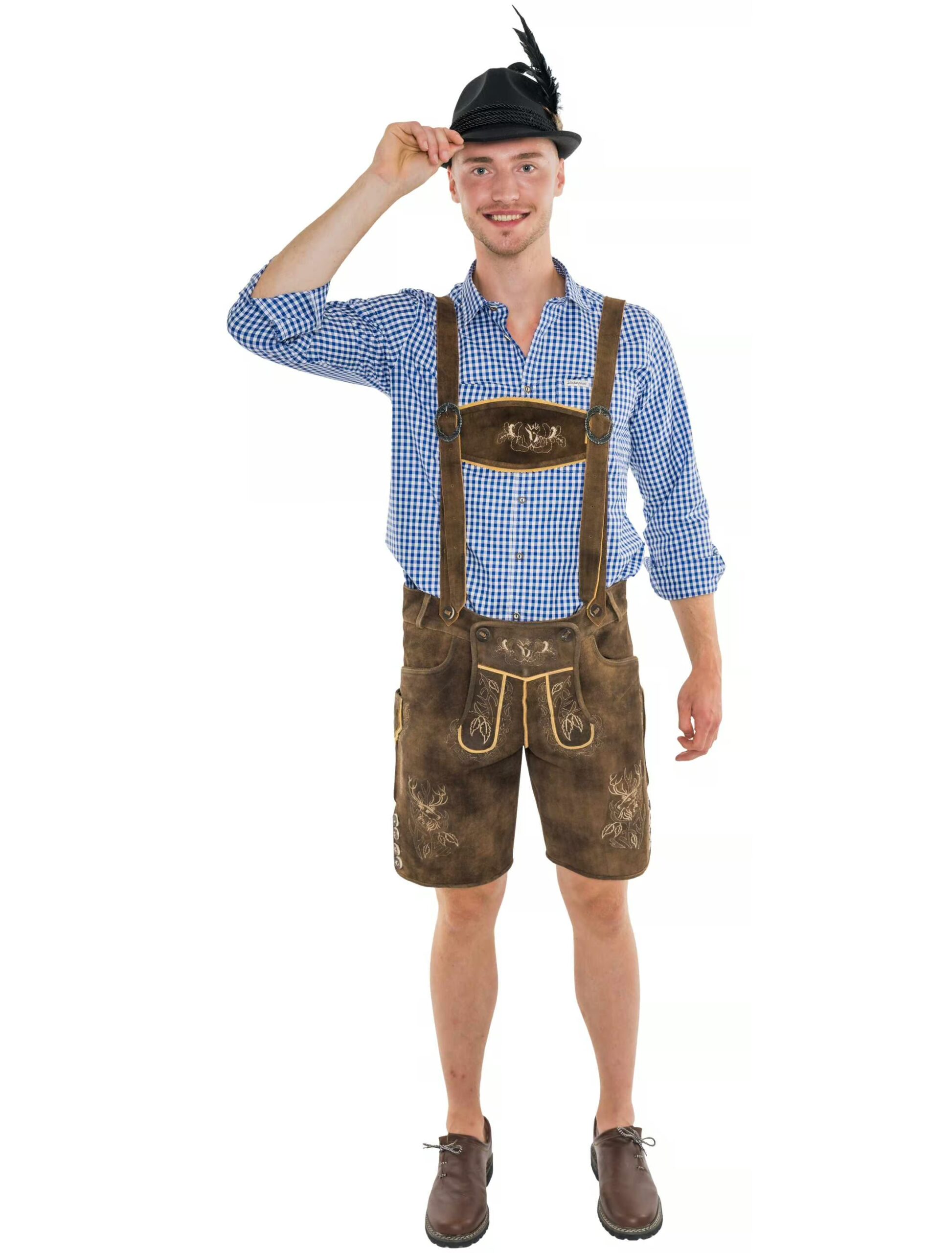 Werde der König der Wiesn – Mit unserer kurzen Herren Lederhose mit Hosenträgern bist du nicht nur passend gekleidet, sondern bringst auch eine ordentliche Portion Charme und Stil mit! Die edlen Hirsch Stickereien sind der perfekte Mix aus traditionell und modern. Perfekt kombinierbar mit einem lockeren Hemd, einem lässigen Grinsen und, na klar, einer Maß in der Hand. Ob Oktoberfest oder Mottoparty – dieses Teil bringt dich überall hin!