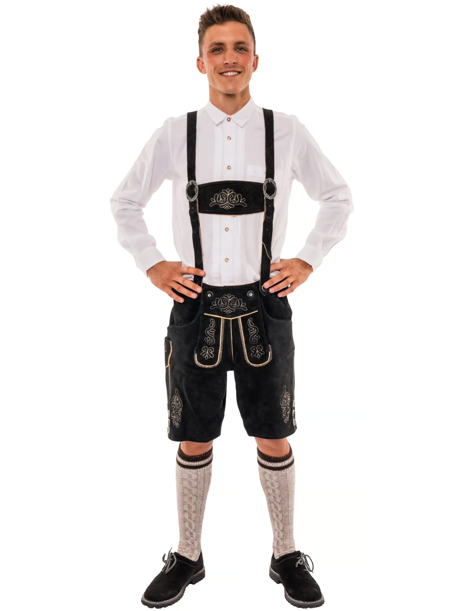 Mit dieser Lederhose machst du dich auf dem Oktoberfest garantiert nicht zum Seppl! Die hochwertige Lederhose in dunkelbraun in traditionellem Schnitt macht dich zum Hingucker auf dem Trachtenfest! Mit dieser Hose bist du nicht nur schick und stattlich gekleidet, die bayrischen Damen werden dich lieben! An beiden knielangen Beinenden befinden sich echte Hornknöpfe und Stickereien, die die Hose verzieren. Die traditionelle Nicker-Tasche auf dem rechten Hosenbein sowie aufwändige Nähte an beiden Beinlängen geben der Hose einen klassischen Trachten-Charme. Die hellen Nähte ziehen sich über das gesamte Gesäß und betonen es so optimal. Der Hosenlatz ist passend zum Riegel mit Stickereien und Nähten verziert und mit echten Hornknöpfen am Bund befestigt. Die Träger sind über den traditionellen Riegel im Brustbereich verbunden und lasen sich ganz einfach über silberne verzierte Schnallen enger und weiter stellen. Um die Hose optimal passend zu machen bieten Schnürungen im Lendenbereich die
