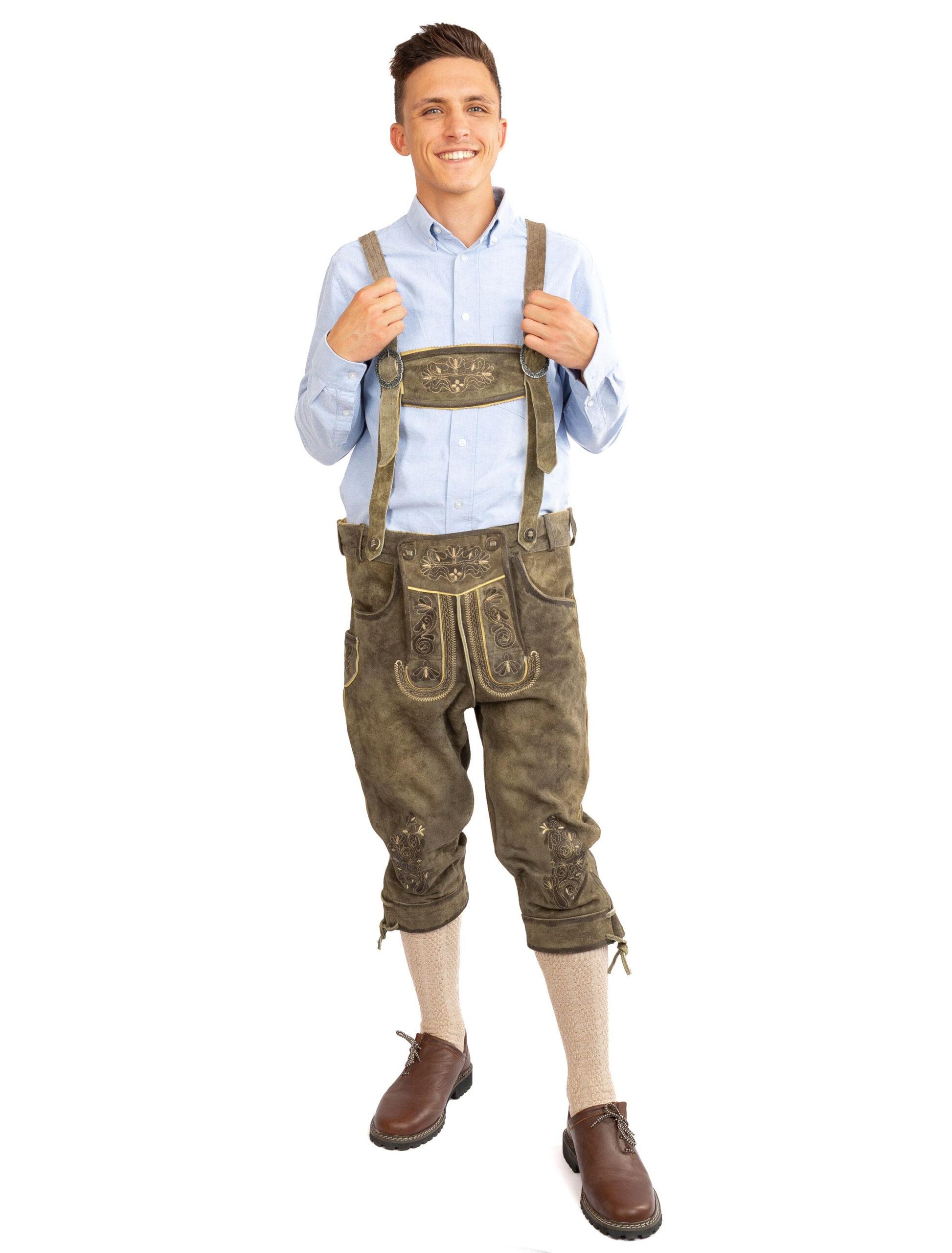 Die Lederhose Siegfried kombiniert klassisches Design mit einer modernen Passform. Gefertigt aus hochwertigem Wildbockleder, überzeugt diese Hose durch ihre edle Optik und den hohen Tragekomfort. Das Leder zeichnet sich durch eine markante Struktur aus, die der Hose eine authentische Ausstrahlung verleiht. Traditionelle Hornknöpfe und rustikale Stickereien an den Beinabschlüssen unterstreichen den klassischen Trachtenlook. Der praktische Reißverschluss ersetzt den traditionellen Latz und sorgt für eine bequeme Passform. Die Lederhose Siegfried lässt sich durch die Schnürungen am Bund und an den Beinabschlüssen individuell anpassen. Abgerundet wird das Modell durch einen Gürtel mit einer altsilbernen Hirschschnalle. Ob fürs Oktoberfest, Karneval oder andere festliche Anlässe – die Lederhose Siegfried ist ein vielseitiger Klassiker, der sich mühelos mit verschiedenen Trachtenoutfits kombinieren lässt.