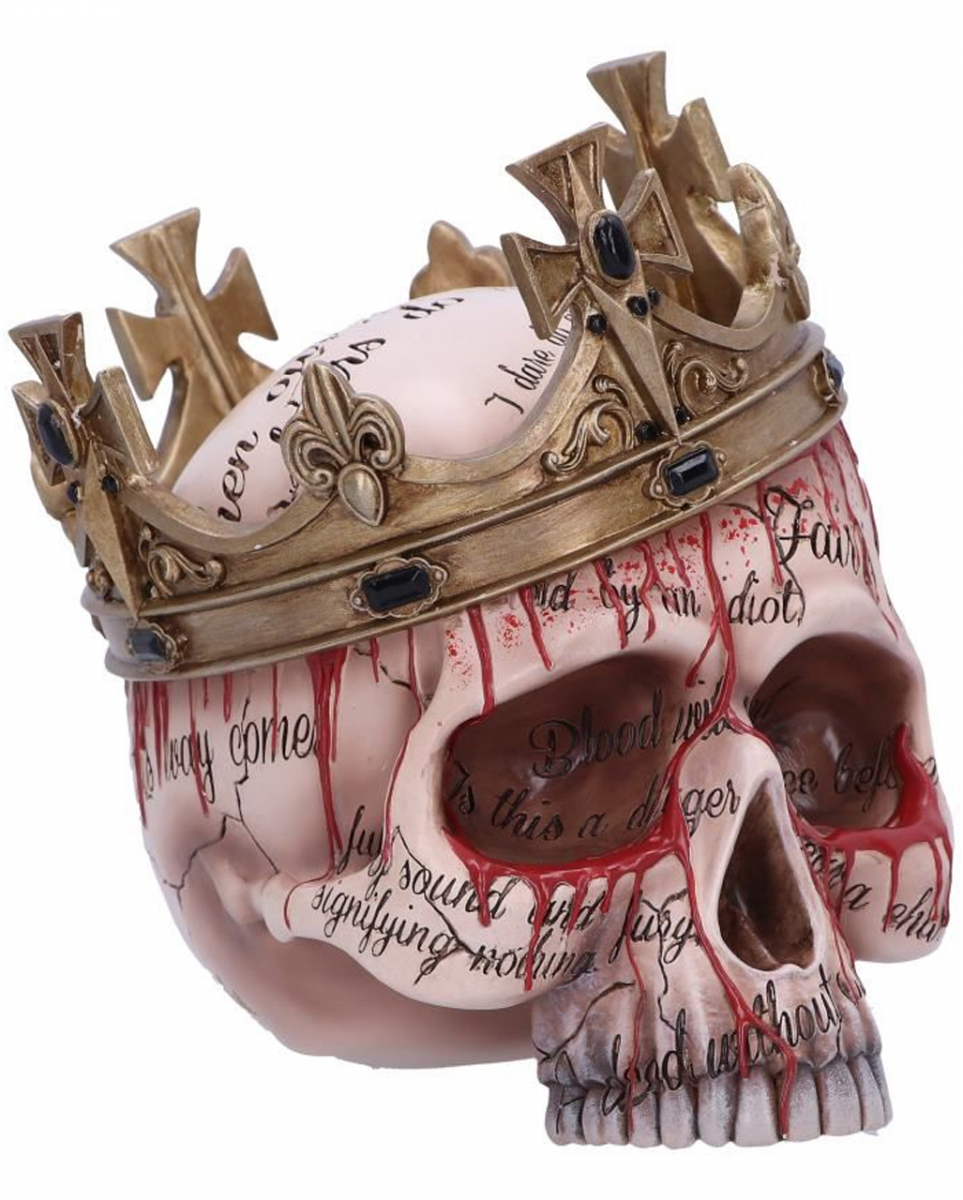 Shakespeares Macbeth Totenkopf mit Krone 15cm Macbeth Deko-Idee für Shakespeare Fans Der Macbeth Totenschädel mit Krone ist an William Shakespeares Tragödie ",Macbeth", angelehnt. Dieser gekrönte Totenkopf ist mit Blut und Zitaten aus dem Werk verziert. Eine opulente Krone, Zitate und Blut zieren Shakespeares Macbeth Totenkopf mit Krone. Unser aus Polyresin gefertigter Schädel ist eine wahre Bereicherung für deine Sammlung und macht sich ebenso gut als Geschenkidee. Lieferumfang: 1 x Shakespeares Macbeth Totenkopf mit Krone 15cm Farbe: Beige, Gold, Rot, Schwarz Größe: ca. 15 cm Material: Polyresin (Kunststein) Mit Zitaten aus William Shakespeares Tragödie Opulente Krone Von der Krone tropft Blut über den Schädel Aus Kunststein gefertigt Von Hand bemalt