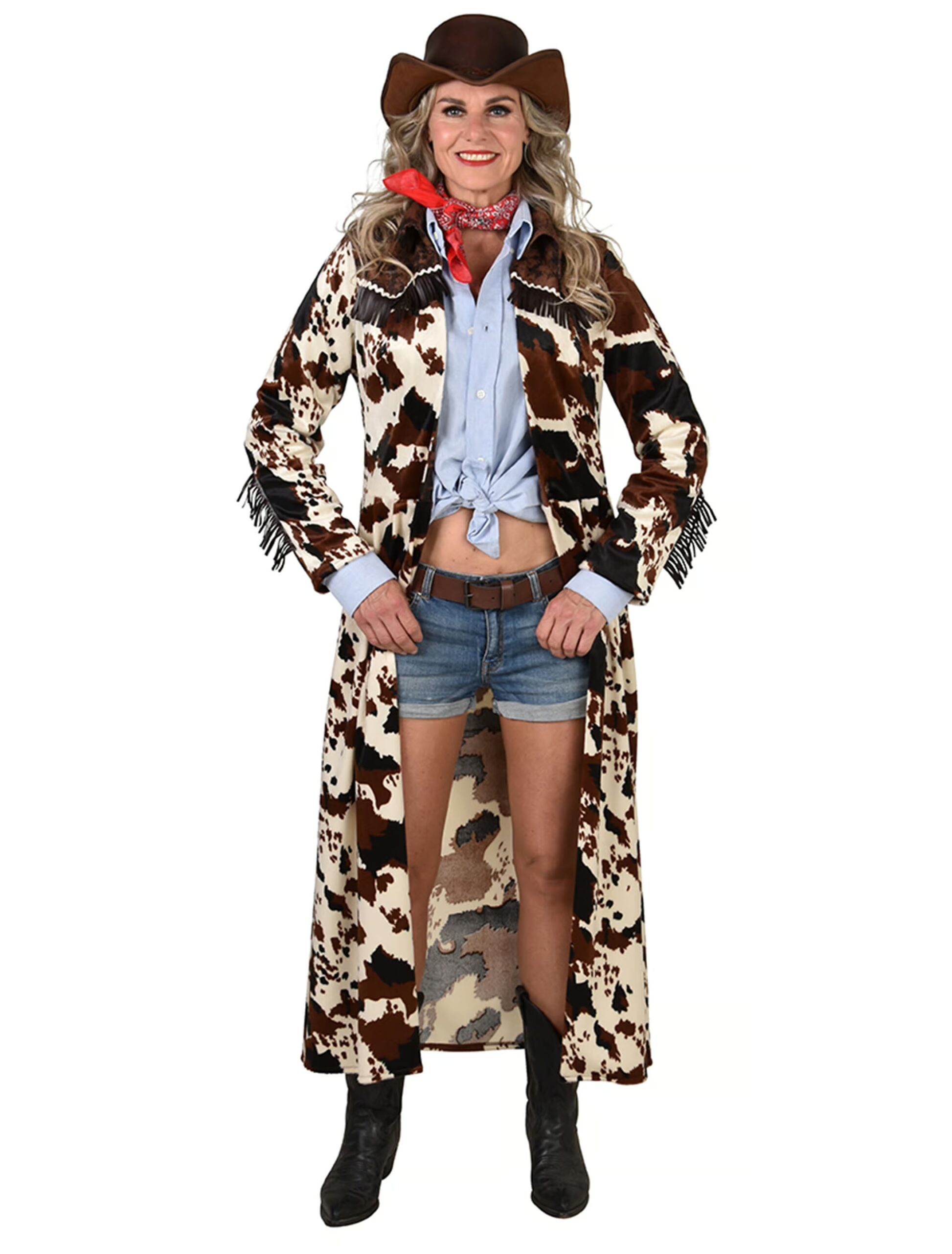 Mantel Cowboy Kuhmuster lang Damen beige/braun 2XL/3XL, ideal für Karneval & Fasching