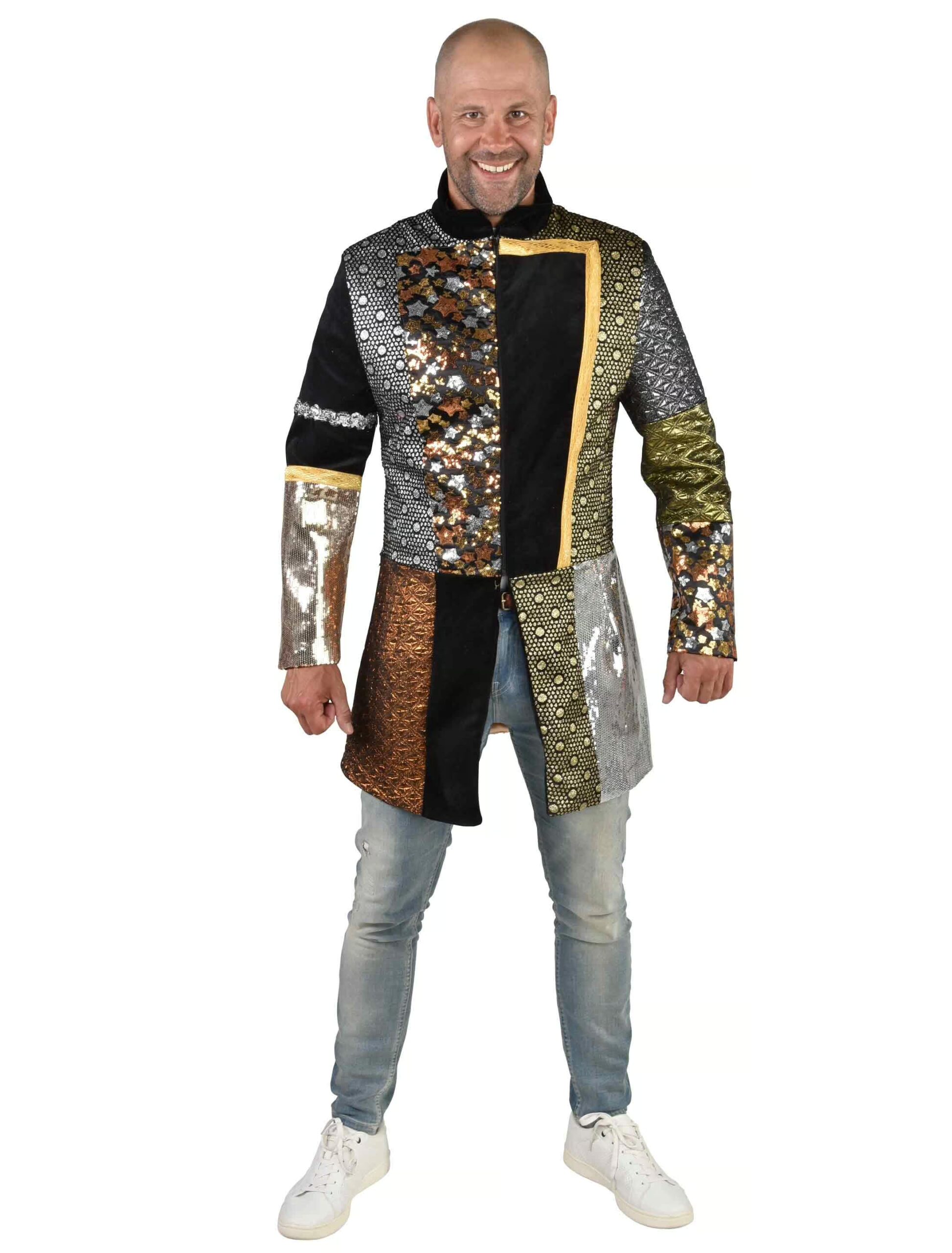 Werde zu einem absoluten Rockstar mit unserem beliebten Metallic Mantel für Herren. Das Oberteil in den Farben Schwarz und Gold eignet sich ideal, um die Bühne an Karneval unsicher zu machen. In vielen Größen kannst Du den Coat für Musiker bestellen und für starke Bässe beim Feiern sorgen. Hübsche Sterne, Kreise und Pailletten zieren die Oberfläche des Mantels, den Du einfach überstreifen kannst. Auch bei einem verrückten Musik Festival kannst Du den Mantel tragen. Exklusiv Artikel.