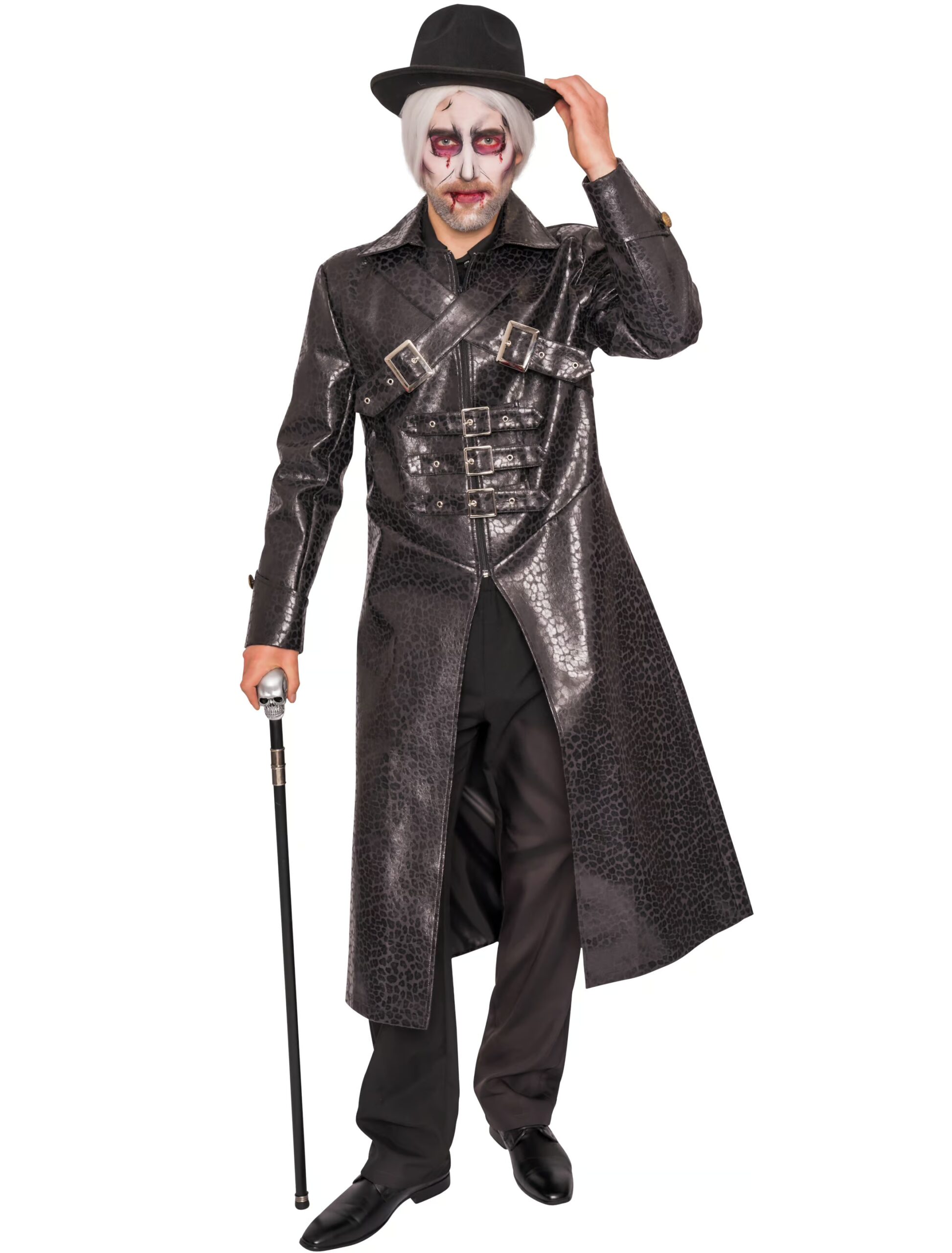 Düster und elegant zugleich! Dieser Mantel ist das perfekte Kleidungsstück für die kommende Halloweenparty. Er besteht aus einem schwarzen Stoff in Kunstleder-Optik und ist mit einem extravaganten Schlangenhaut-Muster verziert. Highlights sind nicht nur der Schnitt, sondern auch die vielen größenverstellbaren Schnallen in der Front, die teilweise über Kreuz verlaufen. Die Ärmel des Herren Kostüms sind mit jeweils einem goldenen Knopf verziert. Der Reißverschluss in der Front rundet den schaurig-schönen Mantel ab. Dein perfekter Begleiter zu Steampunk-, Gothic- und weiteren Halloween-Kostümen!