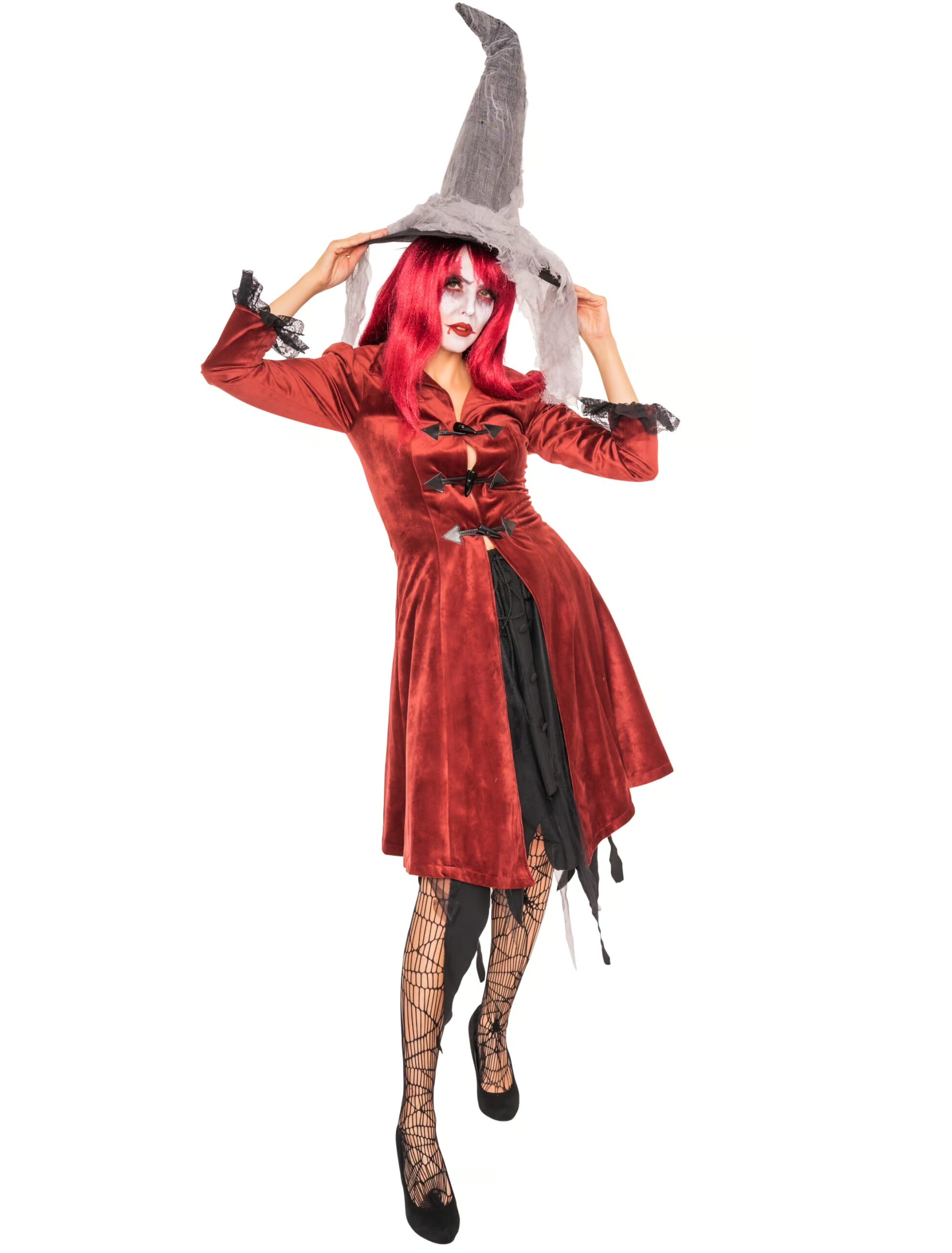 Dieser weinrote Mantel mit Stehkragen aus Polyester ist nicht nur angenehm zu tragen, sondern auch vielseitig kombinierbar. Deinen kreativen Kostümideen sind keine Grenzen gesetzt. Die drei Knebelverschlüsse in der Front betonen Oberkörper und Taille. Die Samt-Optik und schwarze Spitzen an den Ärmelenden setzen diesen wundervollen Mantel gekonnt in Szene. Mit roter Perücke, Netzstrümpfen und Hexenhut wird aus Dir eine unwiderstehliche Hexe. Fehlt nur noch der bei uns separat erhältliche Zauberstab und fertig ist das Hexenkostüm.